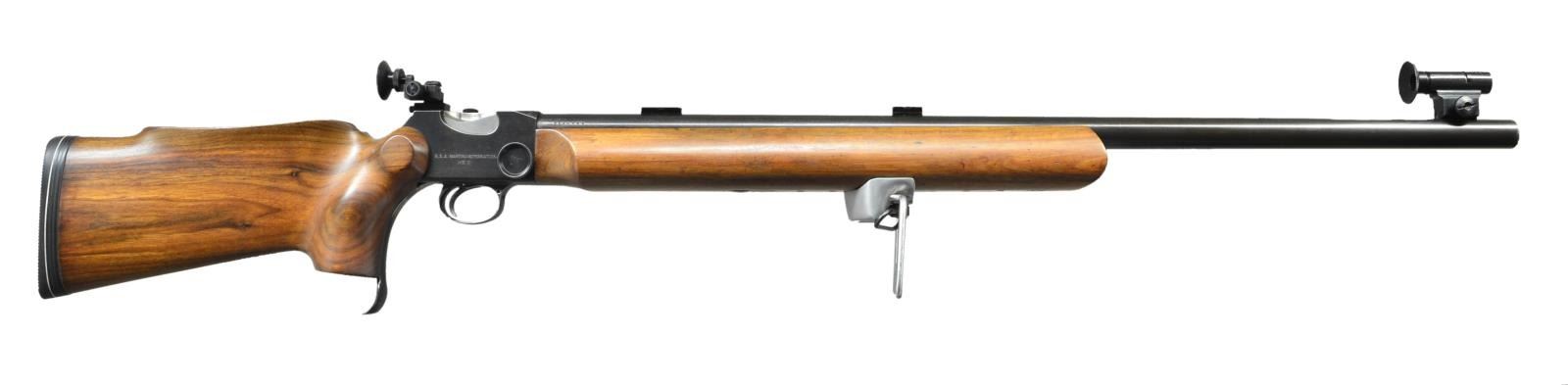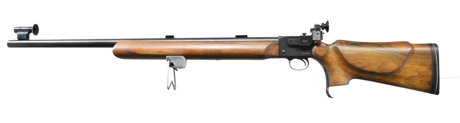 RIFLE. Cal. 22 LR. S# UE4053X. (1953-1959). Duffy's Inc. import marked 29" heavy bbl. w/ recessed crown. Parker-Hales PH1 globe front sight, 2 scope blocks on bbl. 7.25" apart, & Parker-Hale PH258 rail mounted receiver sight. Beavertail walnut forearm w/ aluminum bipod & sling swivel assembly on accessory rail. Pistol grip walnut stock w/ rollover cheekpiece & BSA buttplate. CONDITION: good blue w/ fading finish, handling marks & areas of pinprick oxidation. Very good wood finish plug type repair to left side of forearm. Very good bore. (22-2376/MD). CURIO. $300-500.