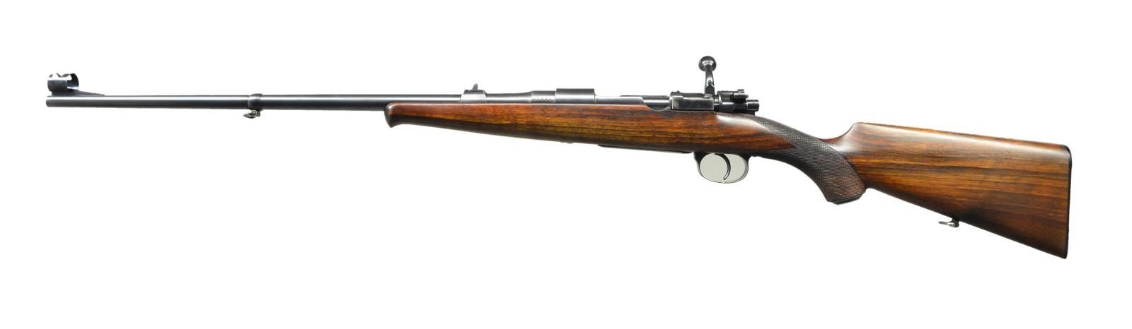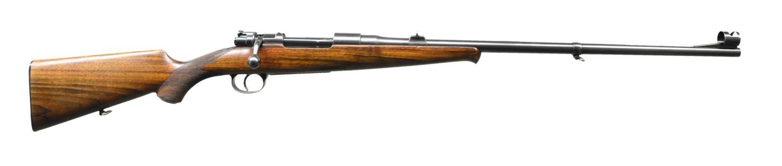 Cal. 9.3 x 62mm. S# 28776. Bbl. 24 3/8" w/ ramped front sight having noticeably lg. hood; big window at top. Mfg. by Husqvarna using FN commercial action having 2 stage military trigger & trigger guard w/ lock screws. K98 style bolt handle; flattened & checkered on bottom. Military style safety & cartridge guide. Left rear of bbl. & bottom front of receiver are matching numbered. Boss area at rear of bbl. w/ drift adj. sight plus banded 7/8" swivel on bbl.; matching on buttstock midway between grip cap & buttplate. Nicely figured walnut stock w/ H logo buttplate & plain grip cap. Checkered pistol grip area & uncheckered abbreviated schnabel forend. Underside of bbl. between swivel & forend is SARCO import marked. CONDITION: very good overall w/ somewhat matte metal finish; Satin finished wood. Near excellent bore. (22-2375/NW). CURIO. $450-600.