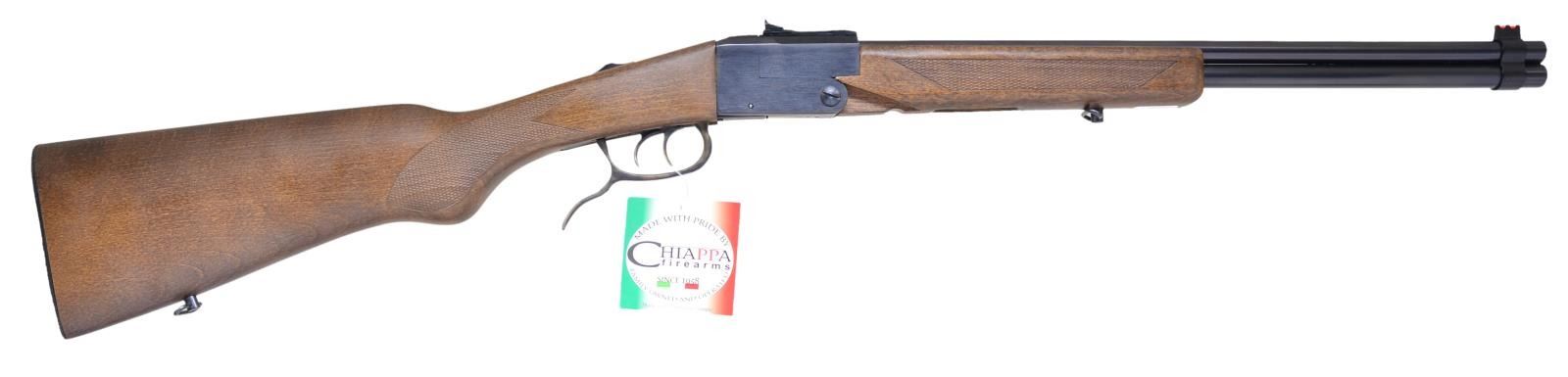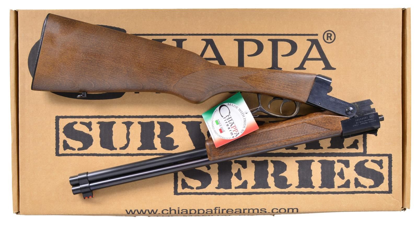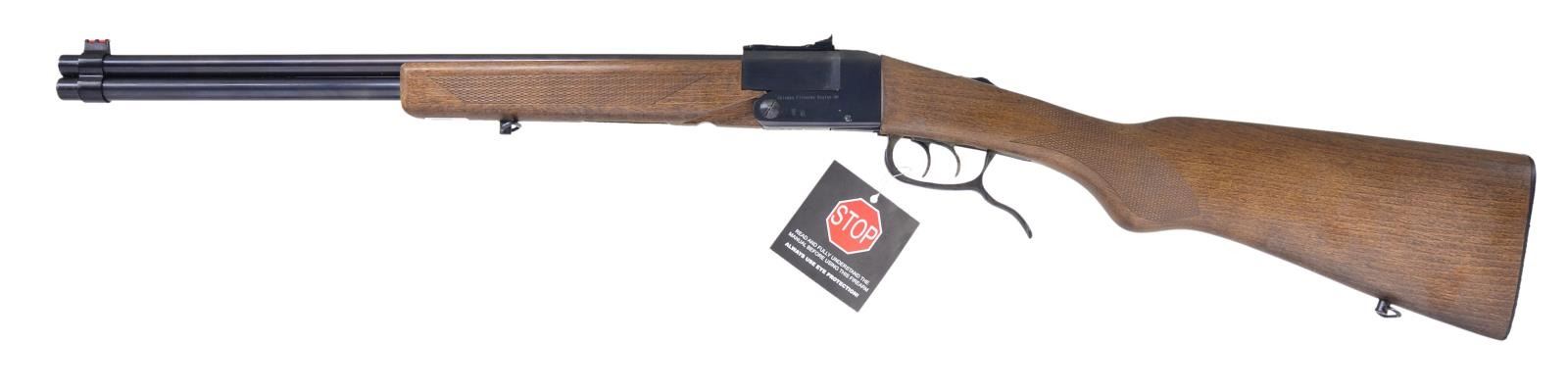 Cal.22 Magnum / 410. S# 16A00227. Bbl. 19". Folding, backpack-style double caliber O/U combo gun. Integrated takedown lever / trigger guard. Matte blued finish on exposed metal surfaces. High-Vis, fiber optic sights, consisting of red front blade & green rear peep sight w/ 2 dots. Checkered walnut stock & forearm. Sling swivels front & rear. Rear tang sliding safety. UNATTACHED ACCESSORIES: Factory cardboard box & paperwork. CONDITION: All aspects appear as new. Bright bores. Wood furniture & blued steel free of any apparent wear illustrating no obvious use. (22-3602/JZ). MODERN. $300-500