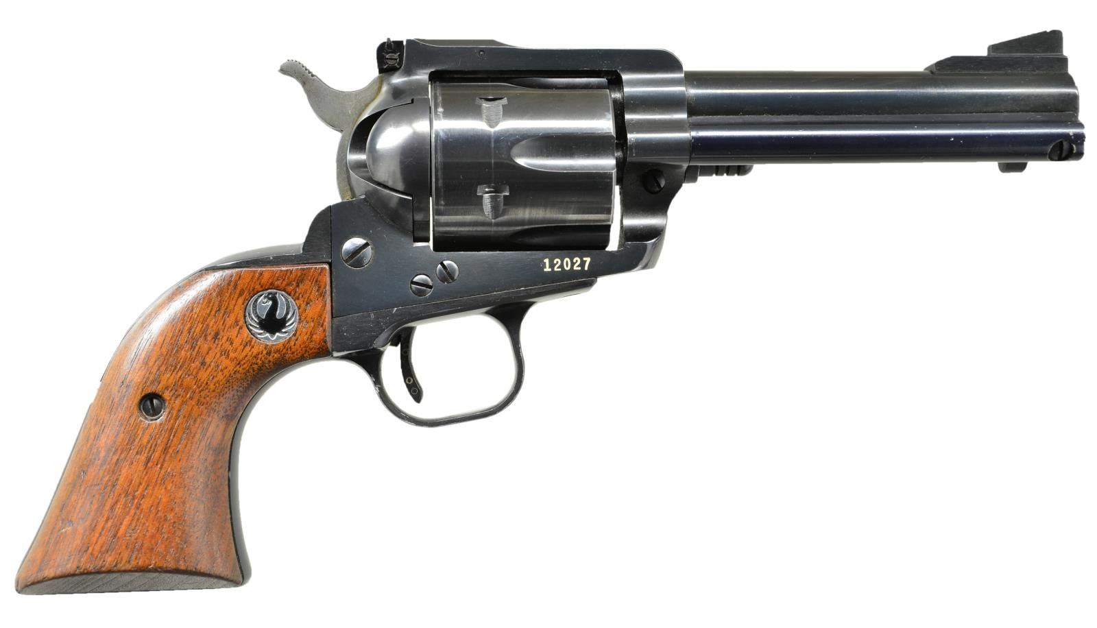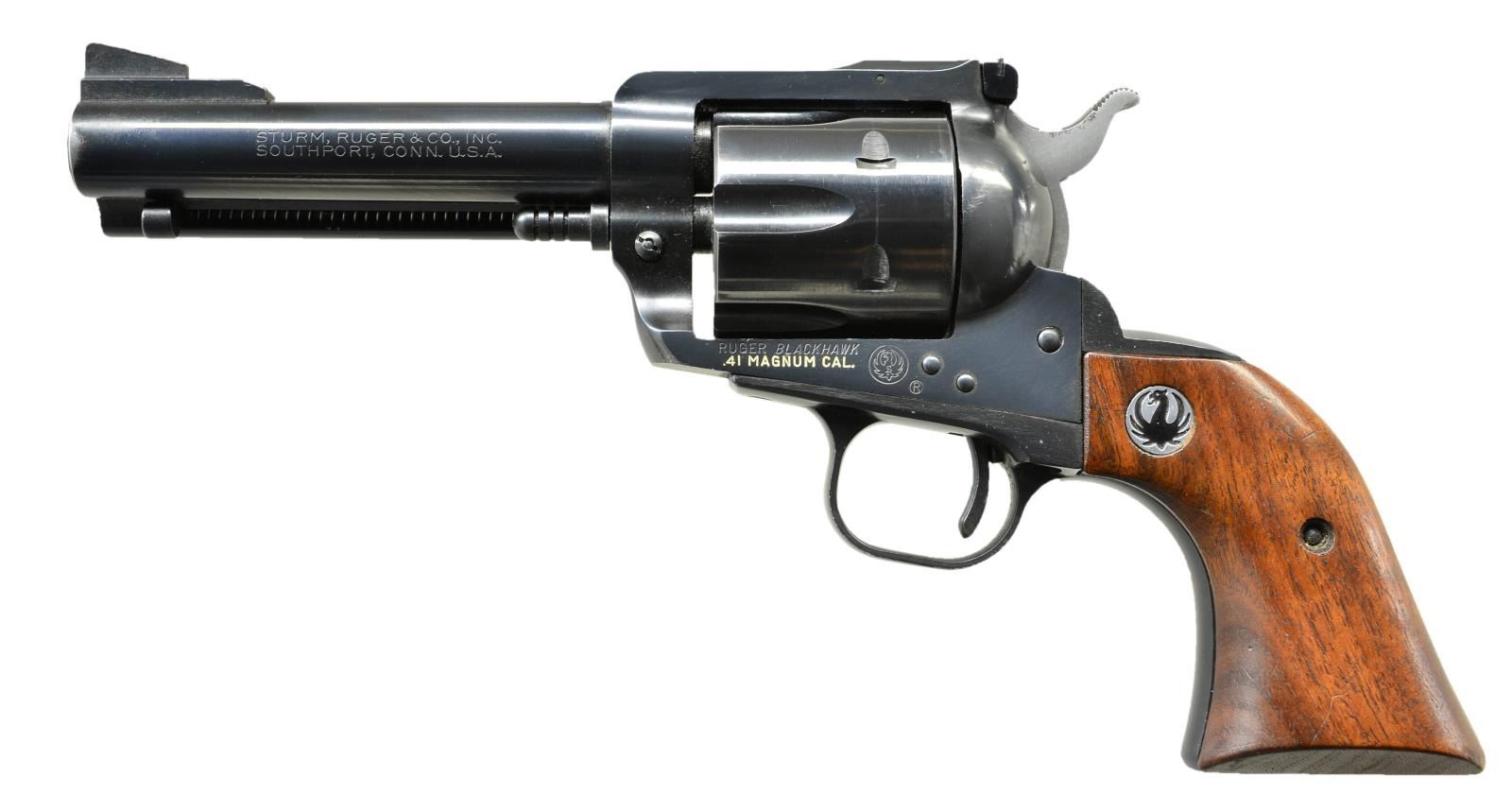 Cal. 41 Mag. S# 12027. Bbl. 4 5/8" having ramped blade front sight & corresponding frame mounted adj. rear. Mfg. 1967 (1965-1973) w/ walnut grips having black eagle medallions. Original lockwork w/out factory safety update. Bonanza gold in some markings. CONDITION: very good to near excellent original finish w/ faint thinning at muzzle & top of front sight. Faint beginning cyl. turn line & sm. marks on trigger guard. Sm. mark on bottom of bbl. from cyl. pin removal. Near excellent bore & grips. (22-3531/NW). CURIO. $500-750.