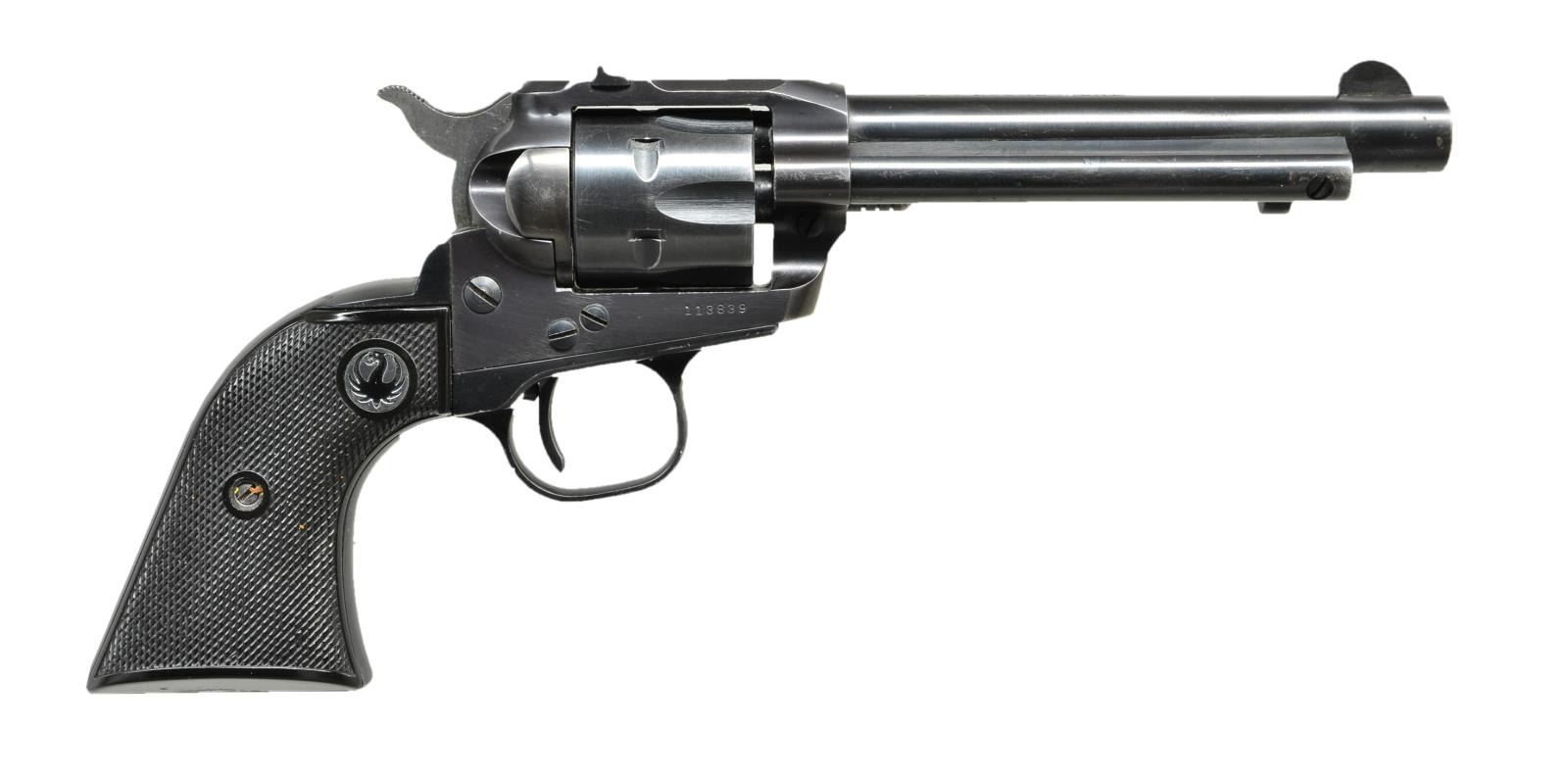 Cal. 22 LR. S# 113839. Bbl 5 1/2". Mfg. 1958. Blade front sight. Fixed rear sight. Old model parts still present. No warning label on bbl. Checkered black Ruger grips. CONDITION: left grip panel shows a small chip at rear, grips have some scattered handling marks. Metal retains 85% original blue w/ some staining on grip frame, high edge wear, cyl wear, Near excellent bore. (22-4266/MJC). CURIO. $200-400.