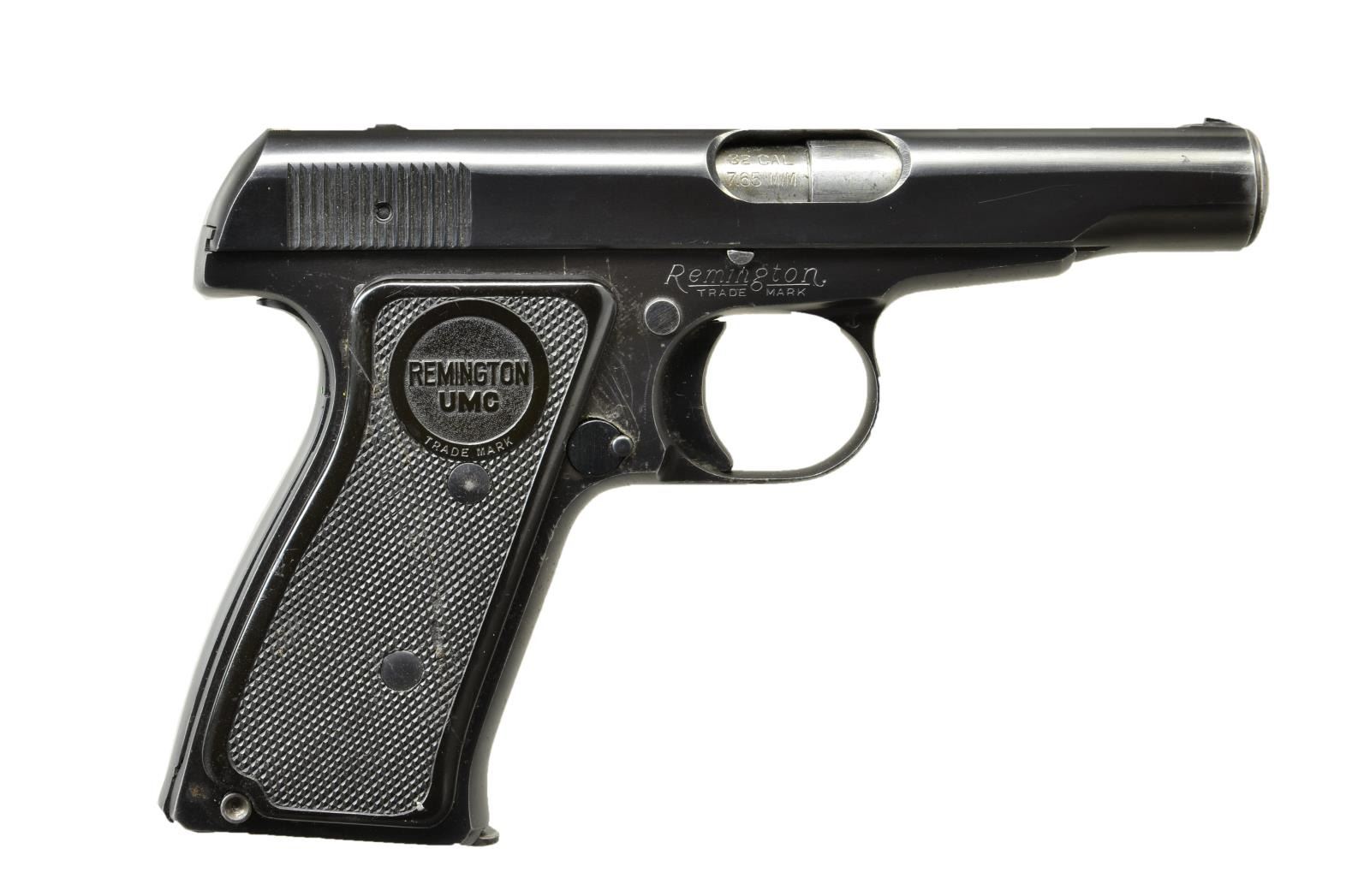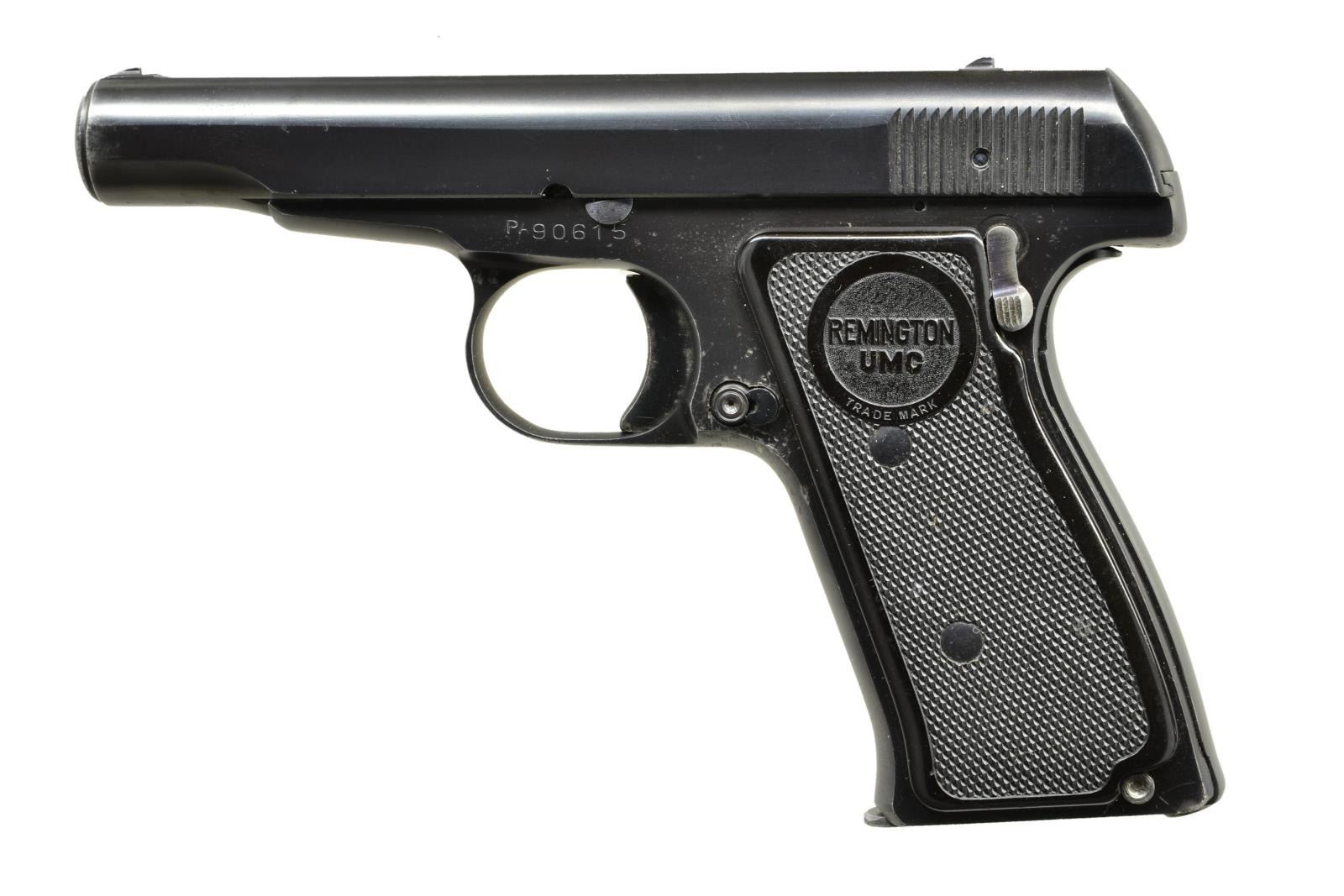 Cal. 32 ACP. Ser. #PA90615. Bbl. 3-1/2". Fixed sights. These pistols were designed w/ a hesitation lock by John Pedersen. Approx. 65,000 were mfg. between 1918-1926. One notable Model 51 owner was General George S. Patton. Pistol is marked on right side of frame "Remington" & "TRADEMARK". Slide is marked on top "Remington Arms Company, Inc. "Ilion, N.Y. U.S.A." & patent information. Marked on left top of trigger guard w/ "RS". Bbl. is marked in ejection port "32 CAL" & "7.65 M/M". Grip safety, side safety, & mag. safety. Checkered black composite grips w/ "REMINGTON UMC" logos. MAGS: 8 rd. Mag is marked "32 CAL." CONDITION: pistol has 85% original blue finish w/ light high point wear, scattered sm. spots of missing finish notable under trigger guard, & scattered spots of peppery oxidation. Front of slide has light holster wear. Grips have light wear & flattening of diamonds. Notable scratch on right grip. Shiny bore w/ lightly worn lands. (22-4328/RW) CURIO. $350-550.