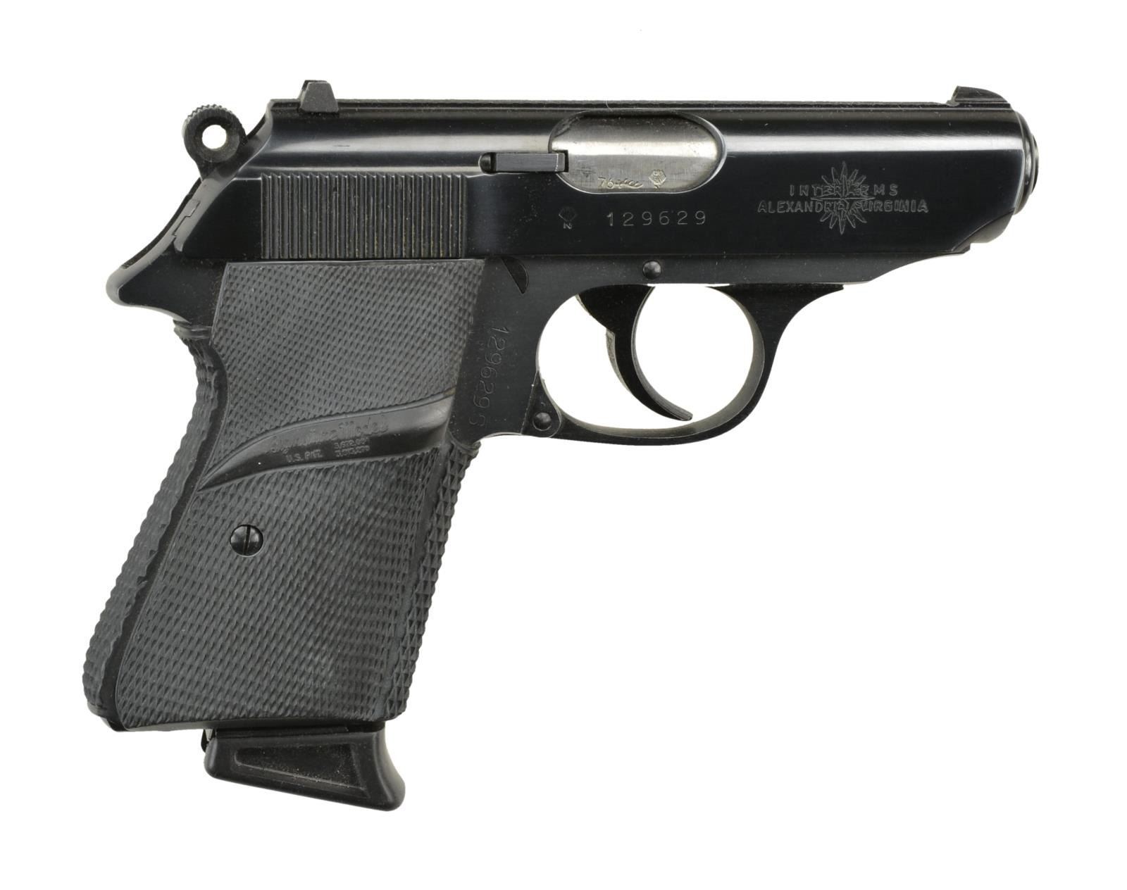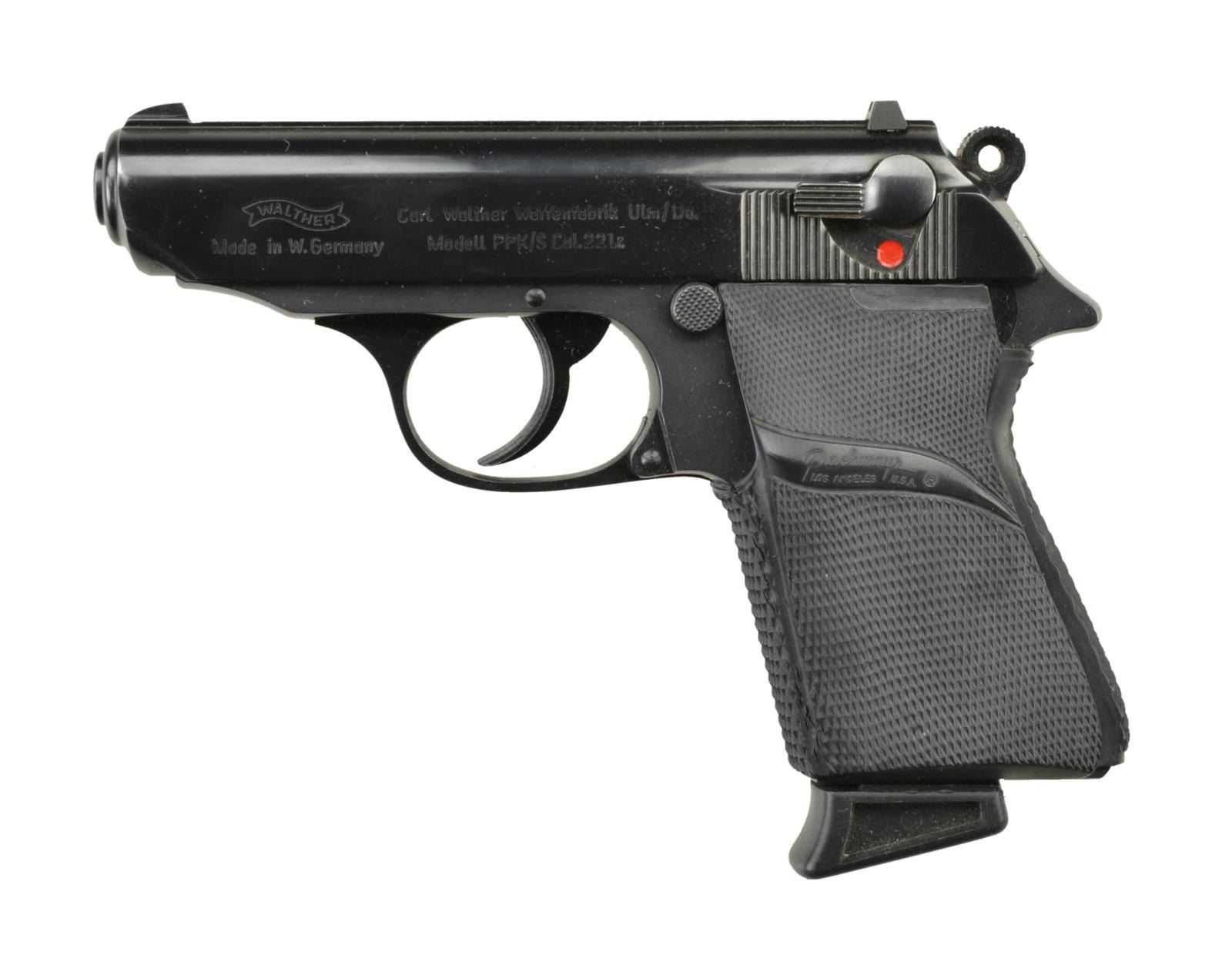 Cal. 22 LR. S# 129629S. Bbl. 3.3". An Interarms imported German manufactured (1976) Walther PPK/S chambered in .22 LR. Traditional double action. Deep blued finish on slide w/ matte black frame. Weave serrated flat top on slide w/ fixed sights. Left side decocker / safety. Serrated hammer spur. Left side mag. release. Pachmayr black wraparound rubber grips. MAGS: factory 10 rd. CONDITION: finish is complete & consistent w/ light thinning in areas of mechanical interaction. Grips demonstrate some gentle wear. Bore is bright w/ strong rifling. Fire control mechanism appears to function correctly when cycled by hand. (22-3064/JZ). MODERN. $500-700.