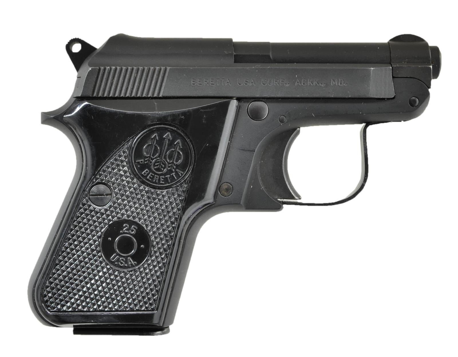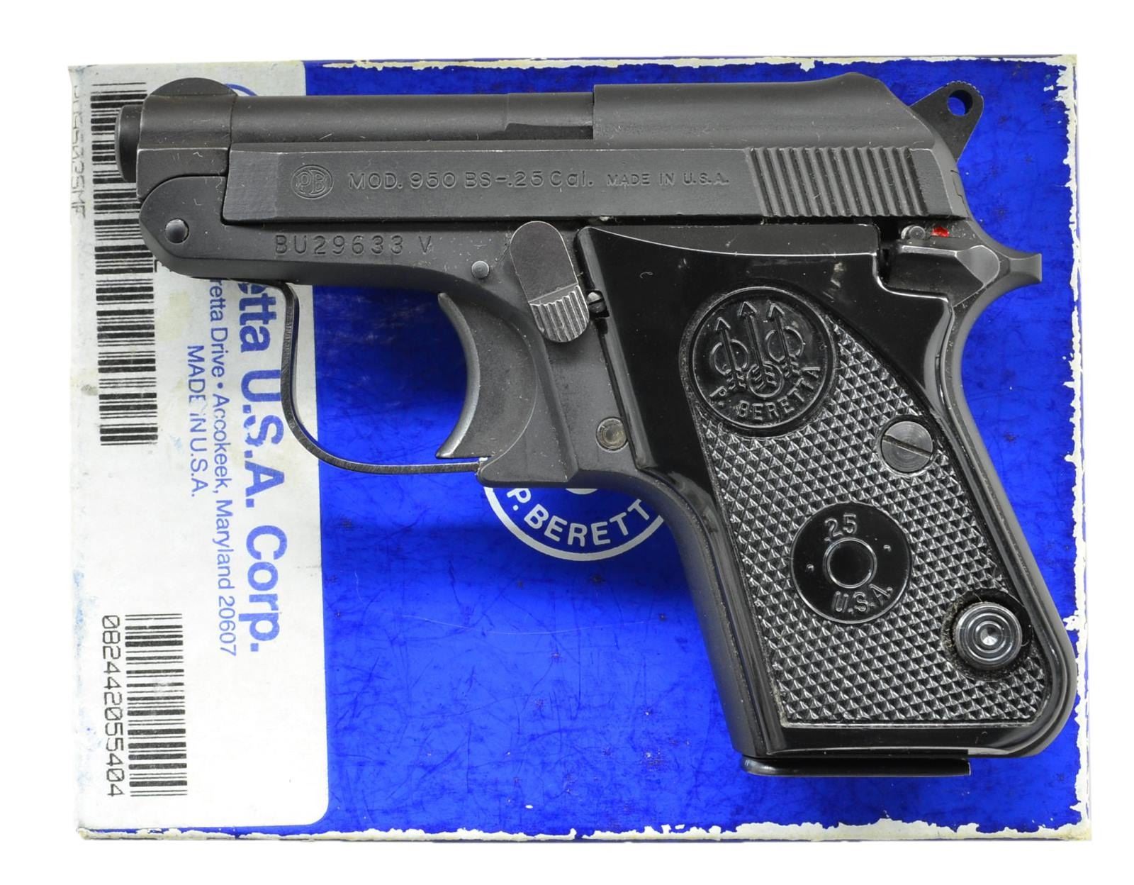 Cal. 25 ACP. S# BU29633V. Bbl. 2 1/2". Round blade front sight. U notch rear sight. Checkered black grips w/ Beretta arrow logo. MAGS: 1-7 rd. UNATTACHED ACCESSORIES: factory box end-labeled to gun & paperwork. CONDITION: grips show light scratches & handling wear. Metal retains 95% original phosphate w/ some high edge wear & light scratches. Very good plus bore. (22-4367/MJC). MODERN. $200-400.