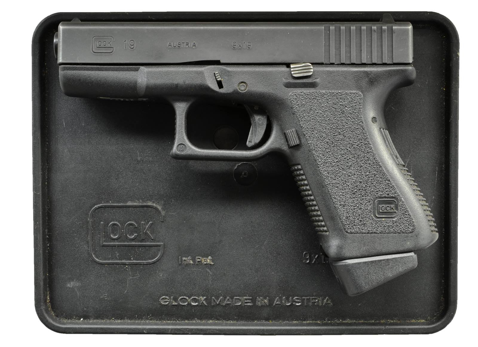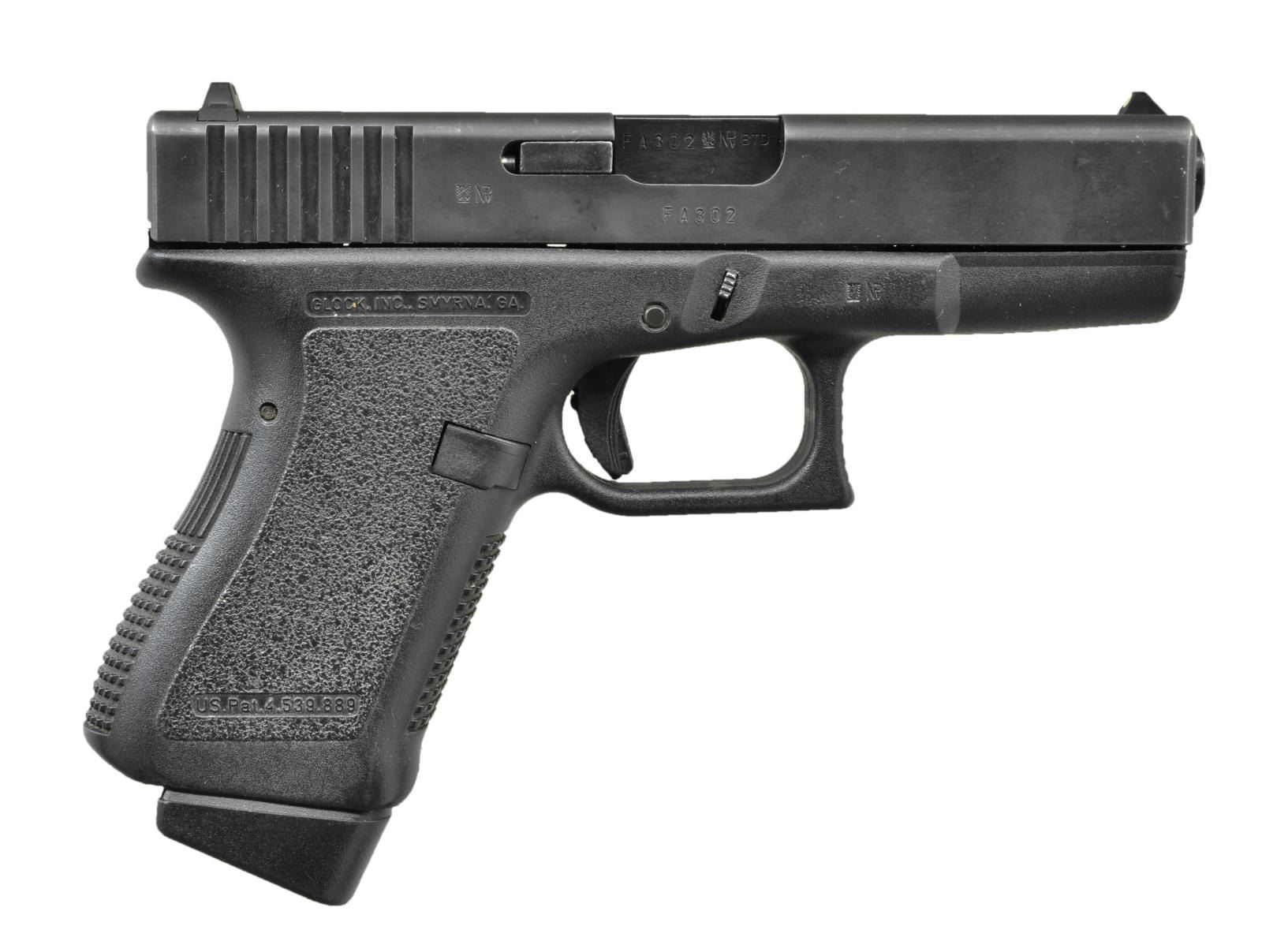 Cal.9mm Parabellum. S# FA302US. Bbl.4". Second generation Glock model 19. Black plastic frame. Checkered front & back straps. Rear serrated slide. Standard fixed white dot front and white outline rear sights. MAGS: 2 factory 15rd, each w/ Glock +2 floorplate. UNATTACHED ACCESSORIES: Black plastic Glock case, mag loader, cleaning rod & paperwork. CONDITION: Original finish is complete & consistent, enjoying full coverage w/ some very light thinning at muzzle. Bright bore w/ sharp rifling. Fire control mechanism appears to function correctly when cycled by hand. (22-4337/JZ). MODERN. $350-550