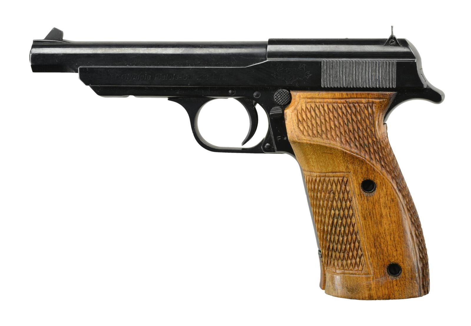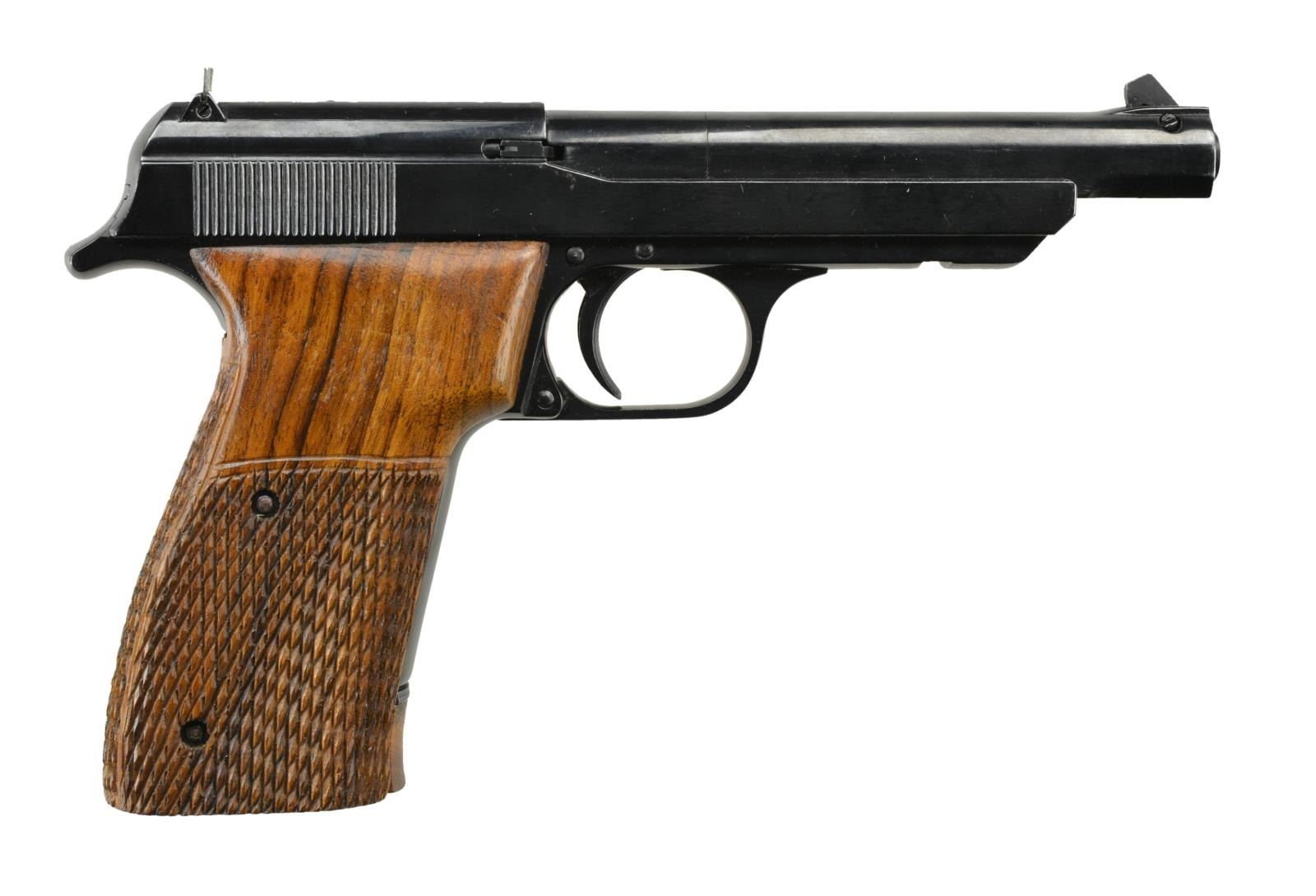 Cal. 22 LR. S# 70880 Bbl. 4.75". Fixed sights. Blued finish. Wraparound two piece hardwood checkered grips w/ thumb rest. MAGS: 1 - 10 rd. wood bottom w/ "0848" on spine. CONDITION: overall very good w/ a few scattered light handling marks. Very good grips. Very good bright bore w/ distinct rifling. (22-2433/JZ). MODERN. $250-400.