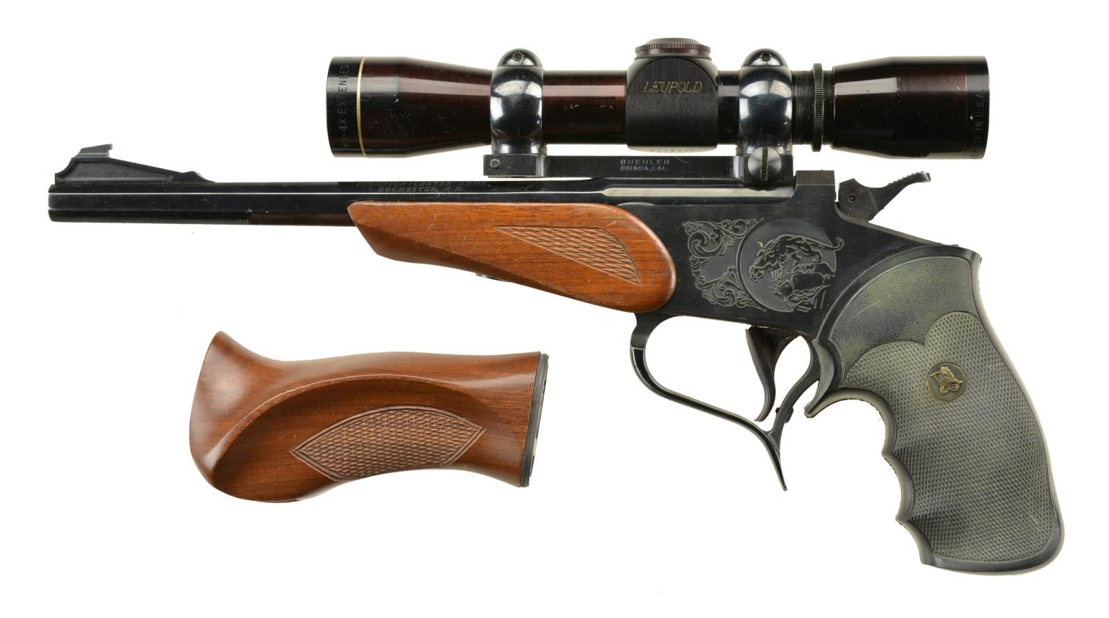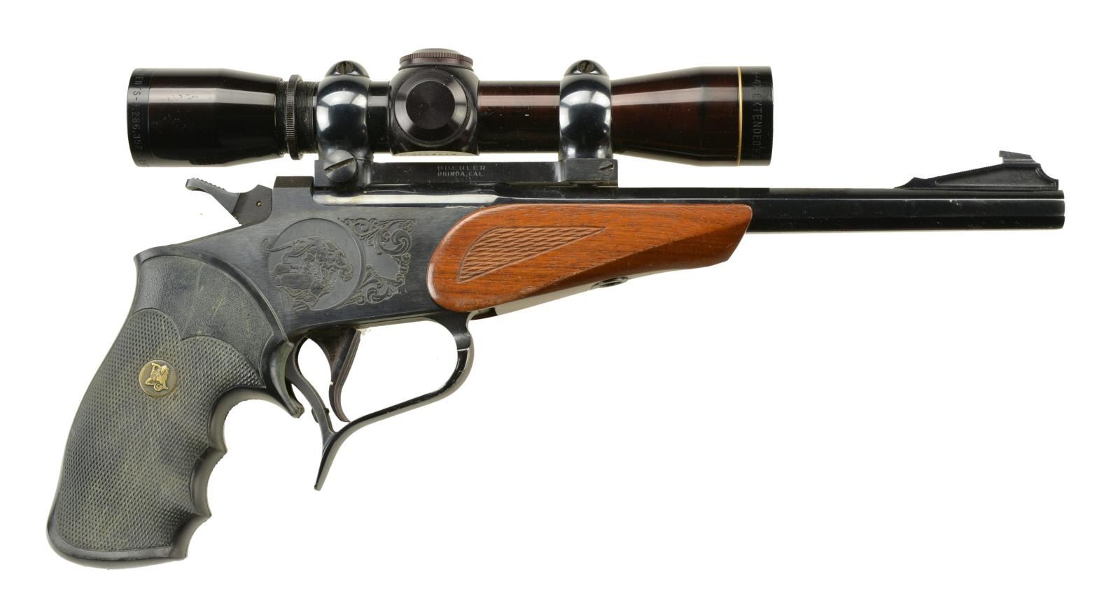 Cal. 22 Hornet. S# 65430. Bbl. 10" octagon. Single shot Thompson pistol currently chambered in .22 Hornet. Buehler scope mount w/ Leupold 4X M8 long eye relief scope w/ duplex crosshair. Checkered hardwood forend w/ matching pistol grip, currently wearing black rubber Hogue grip. UNATTACHED ACCESSORIES: original factory hardwood pistol grip. CONDITION: factory blue thinning at muzzle and on high spots. Scattered light drag lines indicative of normal use. Stocks bear a few light impressions. Scope glass clear w/ sharp reticle. Bore is bright w/ sharp rifling. (22-2770/JZ). MODERN. $500-650.
