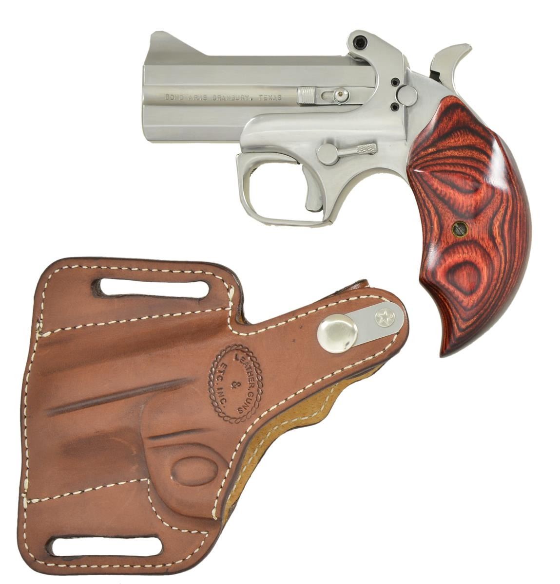 Cal. 45 LC/410 Ga. S# 20744 Bbl. 3.5" Stainless steel double barrel & frame chambered in the powerful 45 Colt / .410 (3"). Single trigger w/ serrated hammer spur. Oversize Rosewood grips. Fixed sights. UNATTACHED ACCESSORIES: Brown leather Bond Defender holster. CONDITION: Exterior surfaces free from any noticeable blemishing. Grips free of nominal lines or impressions. All outward aspects indicate very little use. Bright bore w/ sharp rifling. (22-2435/JZ). MODERN. $200-400