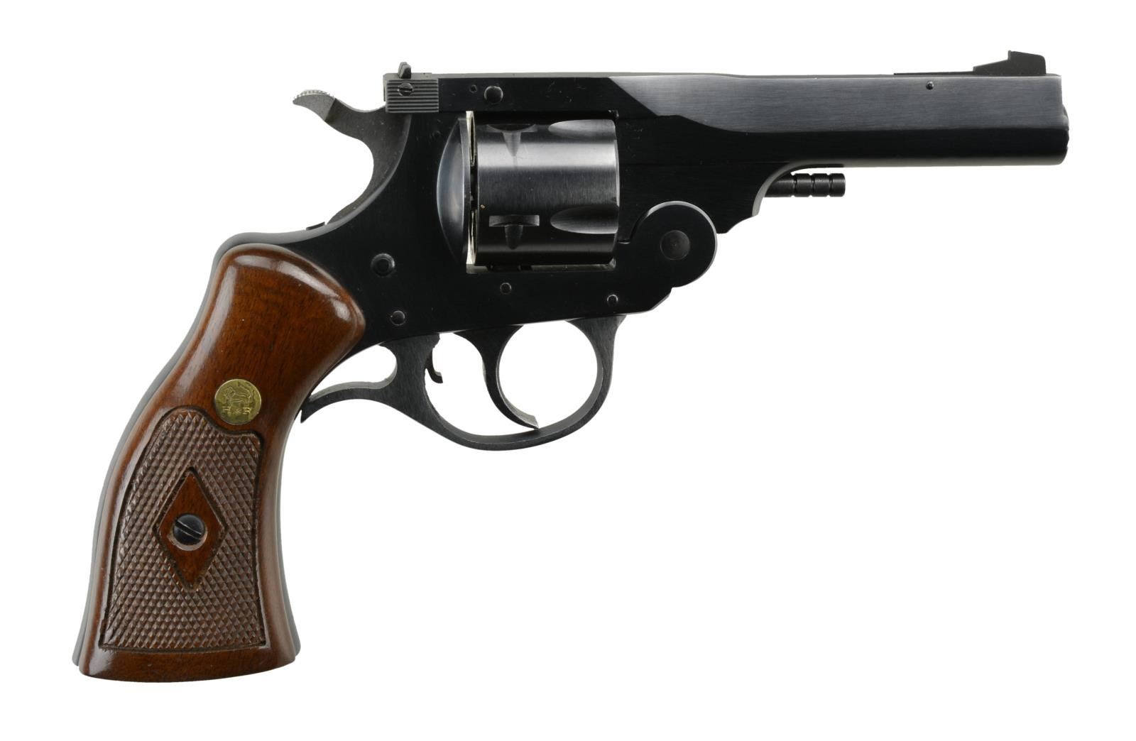 Cal. 38 S&W S# AH68779 Bbl.4" w/ patridge front and adjustable rear sights. Blued finish. Top break action, double action revolver. Fluted 5-shot cylinder w/ manual ejector. Checkered walnut grips w/ gold H&R medallions. CONDITION: Bluing retains full coverage w/ very little sign of use, aside from thin drag line on cylinder. Bright bore w/ strong rifling. (22-2431/JZ). CURIO. $100-200