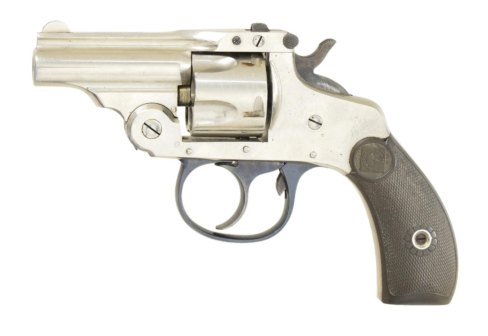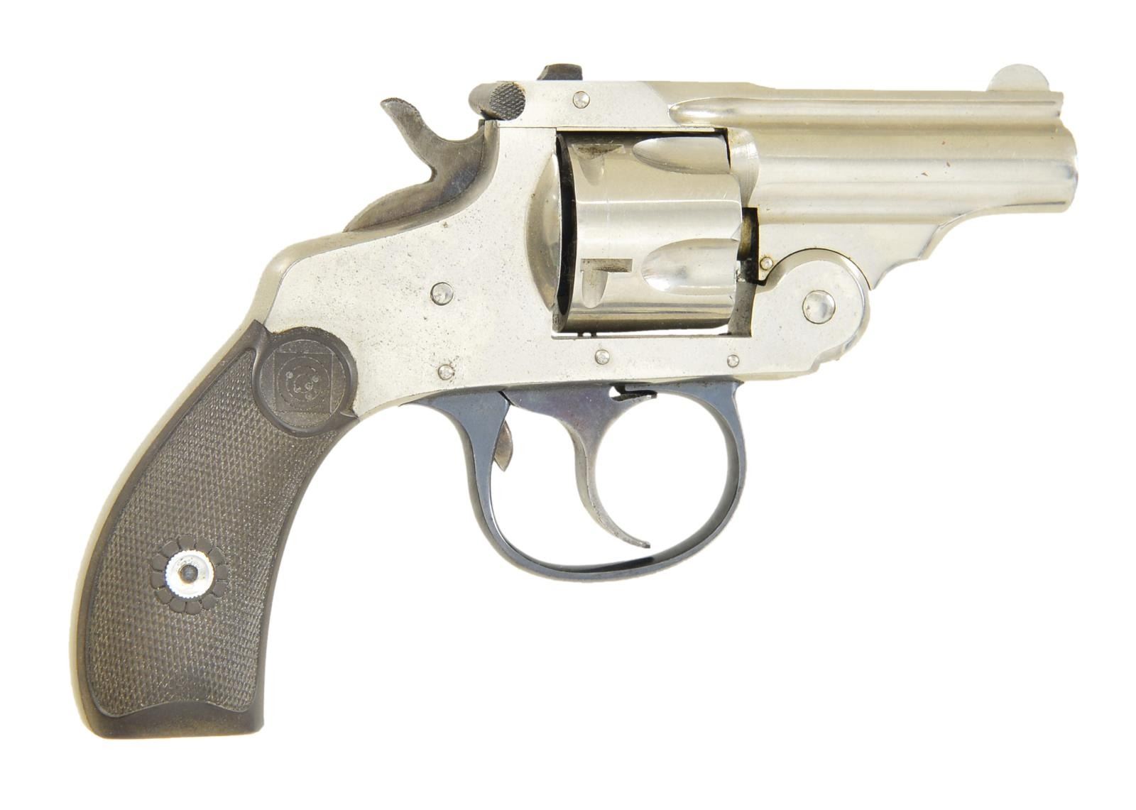 REVOLVER. Cal. 32 CF short. S# A27465. Bbl. 2". Top of bbl. marked "H&R ARMS CO." and "WORSCESTER. MASS." Checkered brown grips w/ target logo. CONDITION: grips show light handling wear & some minor staining. Hammer & trigger retain strong amounts of case colors w/ some fading to gray. Trigger guard retains nearly all blue finish. Balance of metal retains 90% nickel w/ scattered light oxidation & freckling. Good bore w/ a couple sm. pits. (22-2707/MJC). CURIO. $150-250.