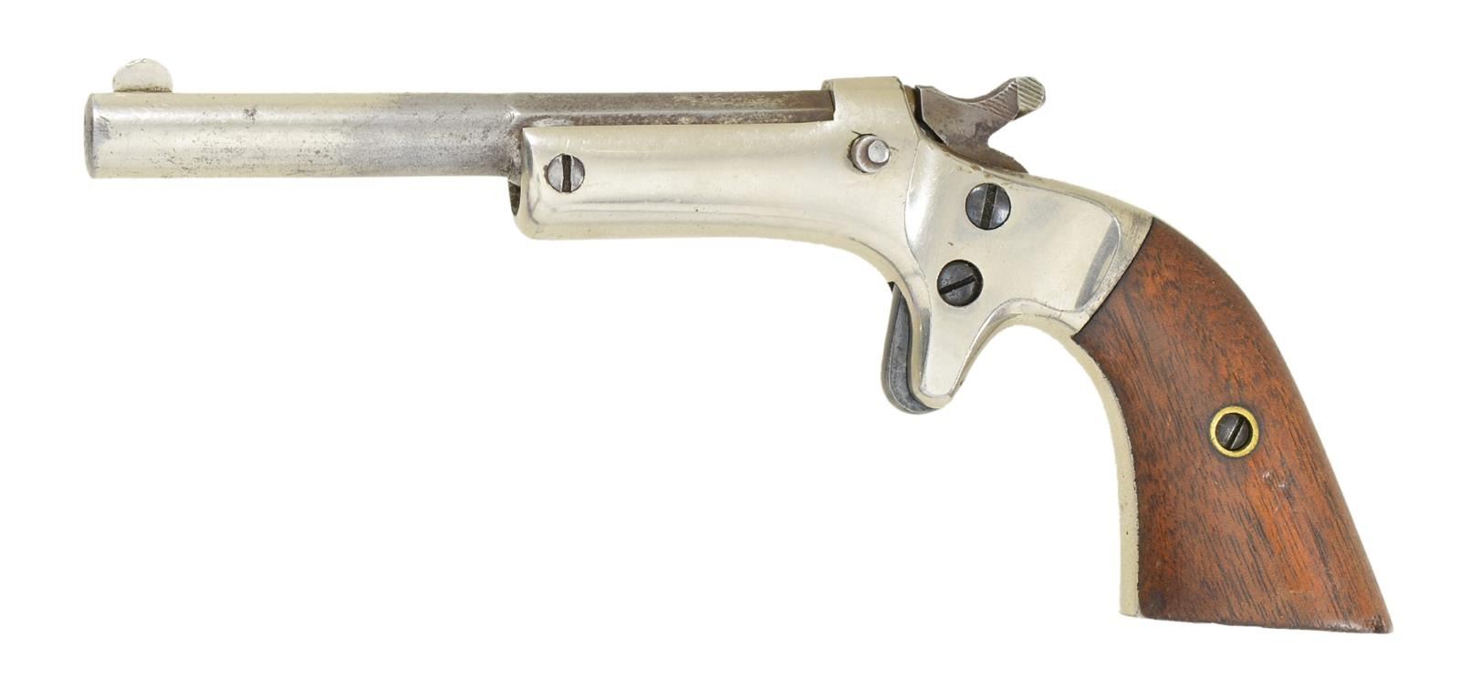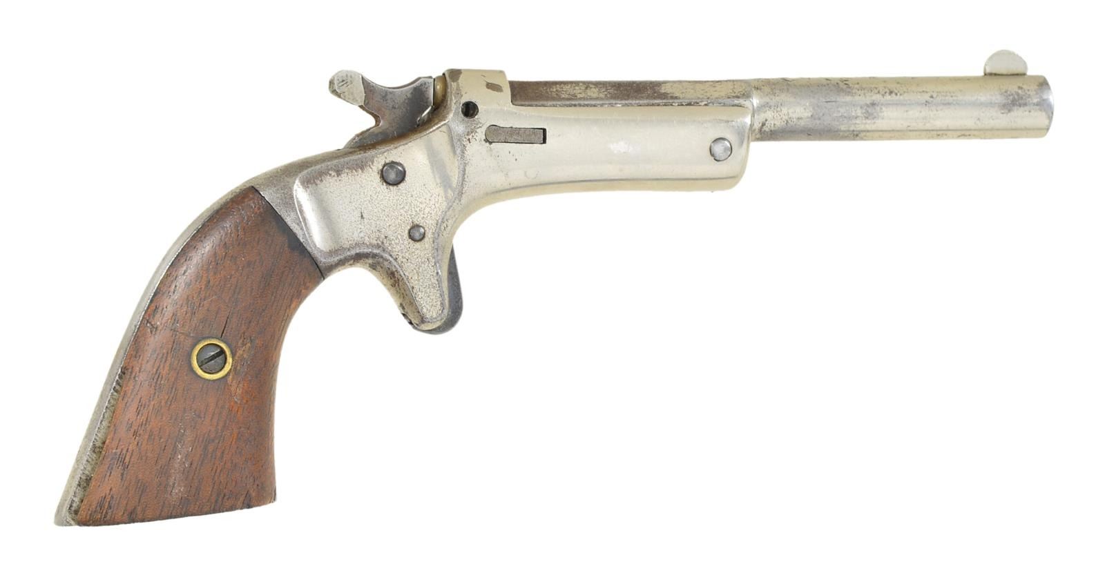 Cal. 22 RF. S# 8378. Bbl. 3 1/2". Top of bbl. marked "J. STEVENS A&T CO." over faint "CHICOPEE FALLS. MASS. USA." Walnut grips. CONDITION: right grip panel has a 1" chip missing from back of left panel. Grips show a few smaller other chips, some dings, scratches & handling marks. Bbl. is a cleaned silvery gray patina w/ some oxidation staining & a few dings on top. Frame retains 75% nickel finish w/ a few dings & some oxidation staining. Worn bore w/ scattered pitting. (22-2704). CURIO. $250-350.