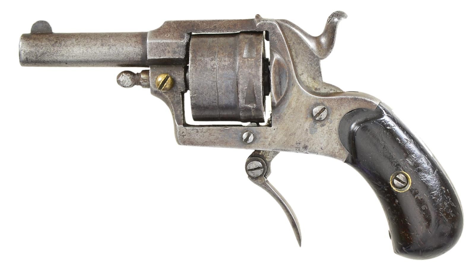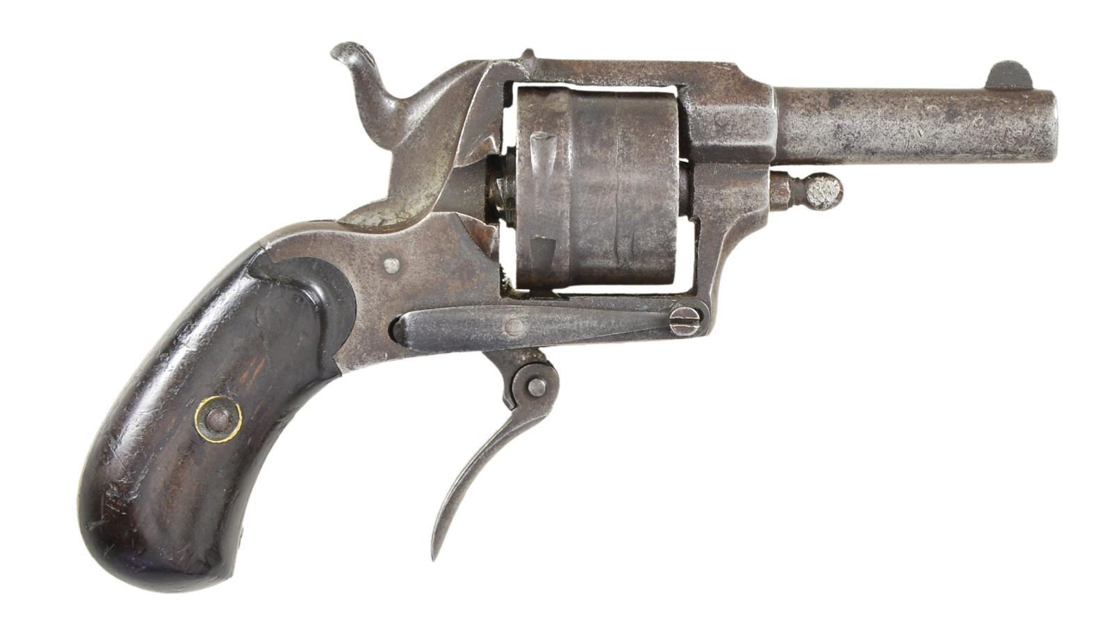 Cal. 230 Eley. NSN. Bbl. 1 3/4" rnd. DA frame is fitted w/ folding trigger. Maker's information, cal. & patent no. are stamped around cyl. Indecipherable proof on right side bbl. shank. Bird's head two piece grips appear to be of walnut. CONDITION: fair to good. Metal w/ dark patina. Information line almost impossible to read except for cal. Trigger needs to be pushed forward for pistol to be fired. Cyl. will not rotate. Bore is rough. (01-21573/MGM). ANTIQUE. $50-100.