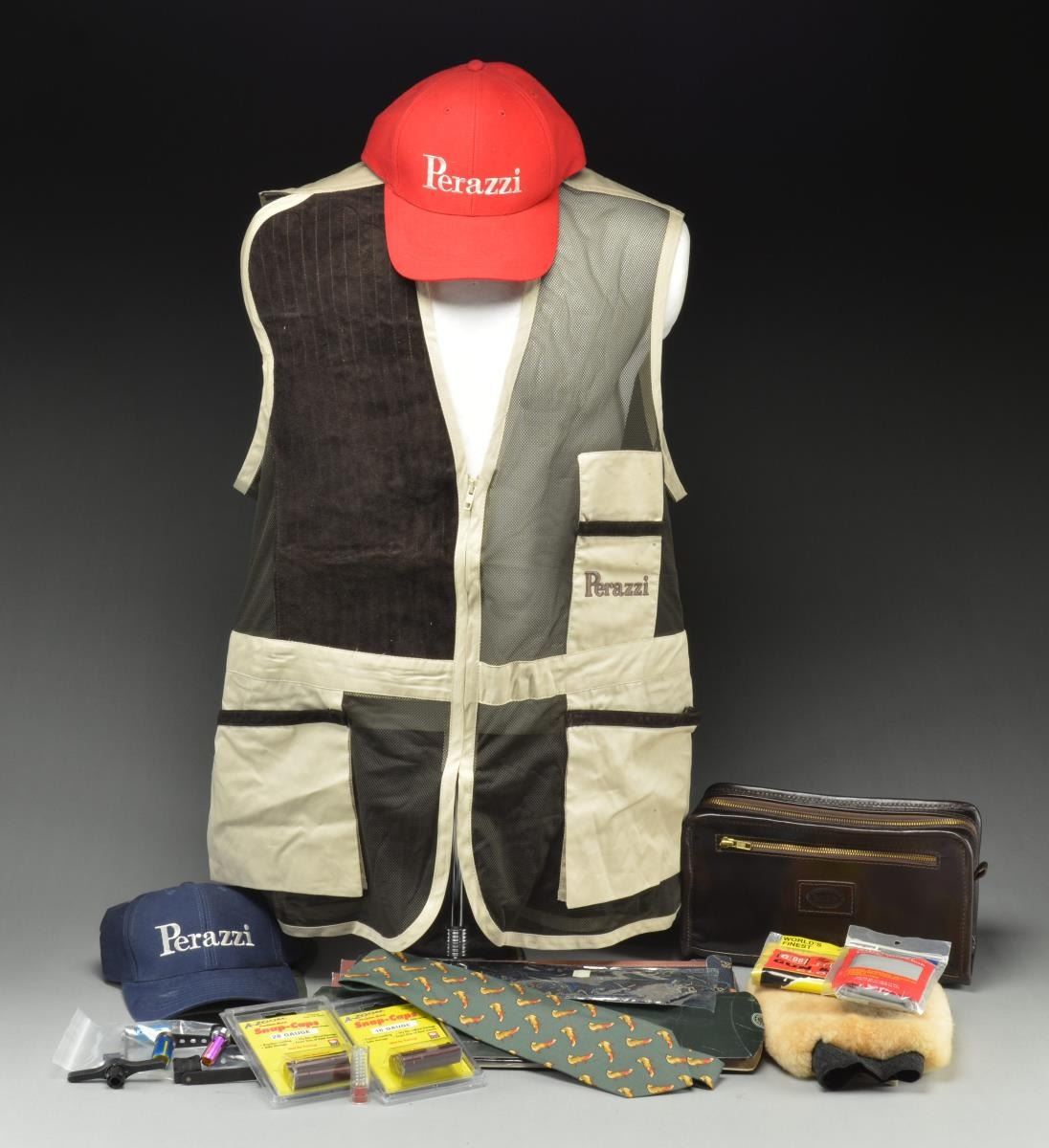 Items also include: Perazzi shooting vest, 7 w/ H& H & Perazzi logos / 3 Hats w/ Perazzi & H& H logos, Lewis Drake buffalo hide case. / 6 screw choke wrenches. / 2 gun clothes. / faux fur mitten. / 28 Ga. & 12 Ga. snap caps. CONDITION: items appears in good to very good. PROVENANCE: From the Collection of Thomas B. Harper Jr. (02-16510/MD). $300-600.