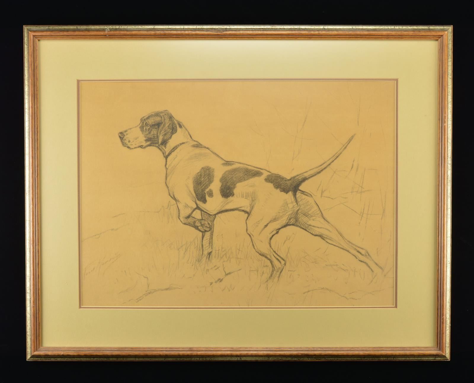 2) Charcoal Study of Pointer for Remington Arms Calender by George Ford Morris. Print: 21 1/2" x 15 1/2". Frame: 29 1/4" x 24 1/4". CONDITION: print has not been removed for inspection. Balance very good w/ light wear on frame & sm. tears to back paper. PROVENANCE: From the Collection of Thomas B. & Freeda Harper Jr. (02-16553/MD). $150-300.