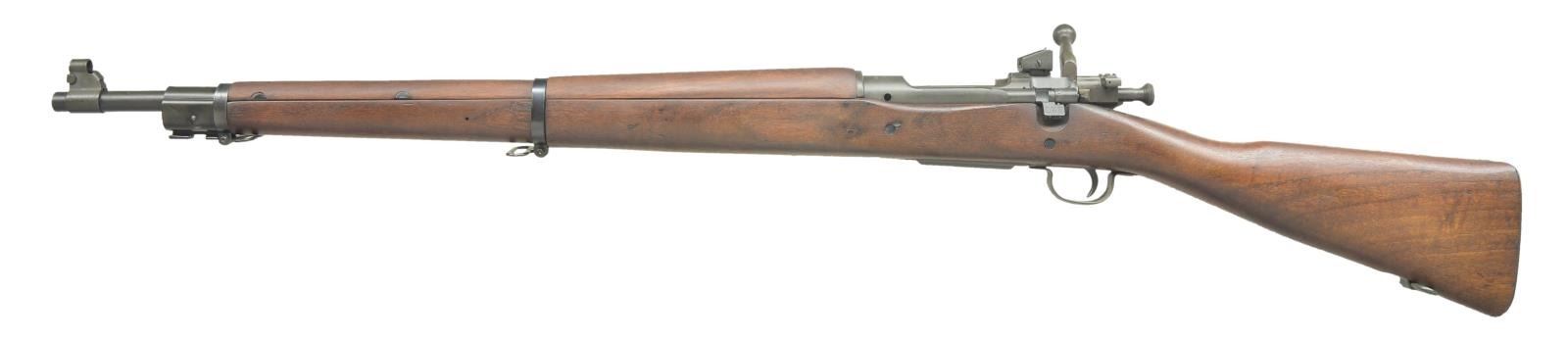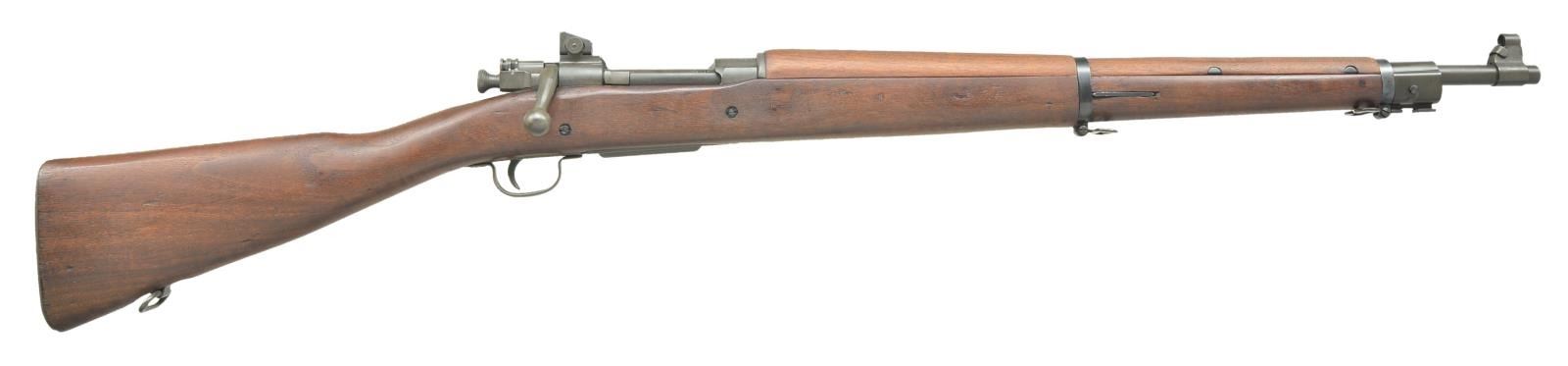 Cal. 30-06. S #3440488. Bbl. 24". Bbl marked "RA" w/ flaming bomb & 1-43 date. Adjustable aperture rear sight. Blade front sight w/ protective hood. Bolt, stock, stacking hook, sling swivels & magazine cutoff are of Remington Mfg. Triggerguard is of Smith Corona Mfg. Bottom mounted sling swivels. Walnut stock set. Stock is marked w/ circled P firing proof on underside of wrist. Left side of stock is also marked w/ unboxed "RA", ordnance wheel and boxed "FJA" stamps. CONDITION: walnut stock shows light dings & handling marks. Blued rear band & front band keeper show some thinning. Balance of metal retains 95% gray arsenal parkerized finish. Very good shiny bore. (22-2566/MJC). CURIO. $400-600.