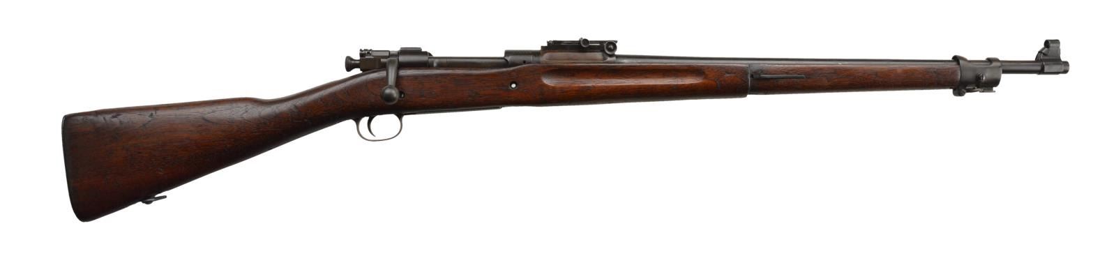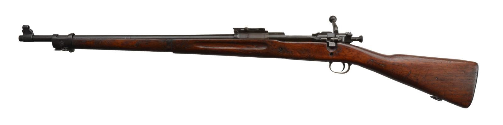 Cal. 30-06. S #100431. Bbl. 24". Early 1903 Rock Island Arsenal rifle w/ 8-11 dated Rock Island Bbl. Ladder rear sight graduated to 2700 yards. w/ volley notch. Fixed blade front sight w/ sheet metal protector. Stock marked with faint arsenal rework cartouche on left side. Buttplate is stippled similar to known USMC rifles but no other USMC traits present. Bolt marked "JI" on lug. Handguard, both recoil lugs and rear band are missing. Walnut stock. CONDITON: walnut stock looks arsenal sanded w/ scattered handling wear and light dings. Metal shows a fading arsenal reparkerized finish w/ some parkerized over pitting on bottom metal, scattered light freckling and thinning. Fair bore showing scattered frosting and light pitting. (22-2611/MJC). CURIO. $400-600.