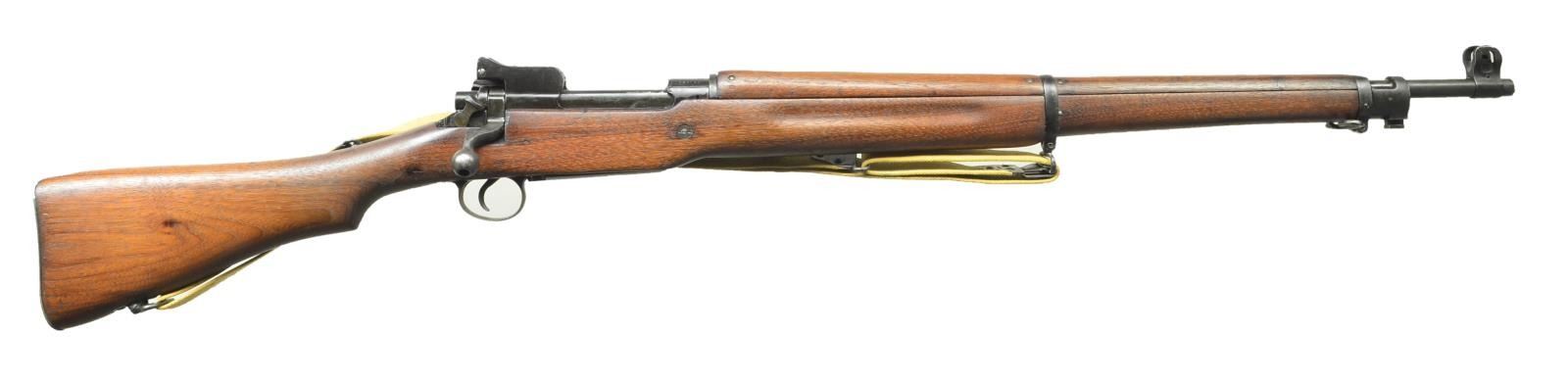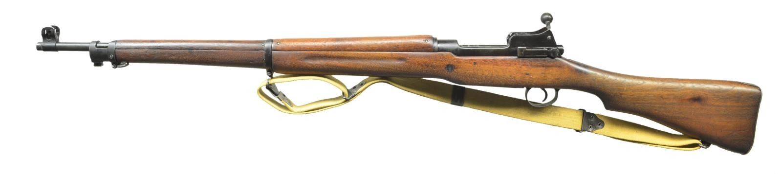 RIFLE. Cal. 30-06. Ser. #884130. Bbl. 26" marked behind front sight "E" "Flaming bomb" "7-18". Ladder rear sight graduated to 1600 yds. Blade front sight w/ protective ears. Receiver marked w/ "Flaming bomb" on left rail. Bolt marked w/ "R" & "Flaming bomb". Rear sight marked "W". Walnut stock set. Forend tip is marked w/ "E" & "7". Trap buttplate & Kerr NOBUCKL sling. CONDITION: stock set has arsenal rework finish w/ moderate wear & handling marks w/ loss of wood in inletted areas & at grasping grooves. Metal work has 60% dark Parkerized arsenal rework finish w/ thinning & wear. Follower has been ground to allow bolt to close on empty mag. Good bore w/ lightly worn lands. (22-4066/RW) CURIO. $350-550.