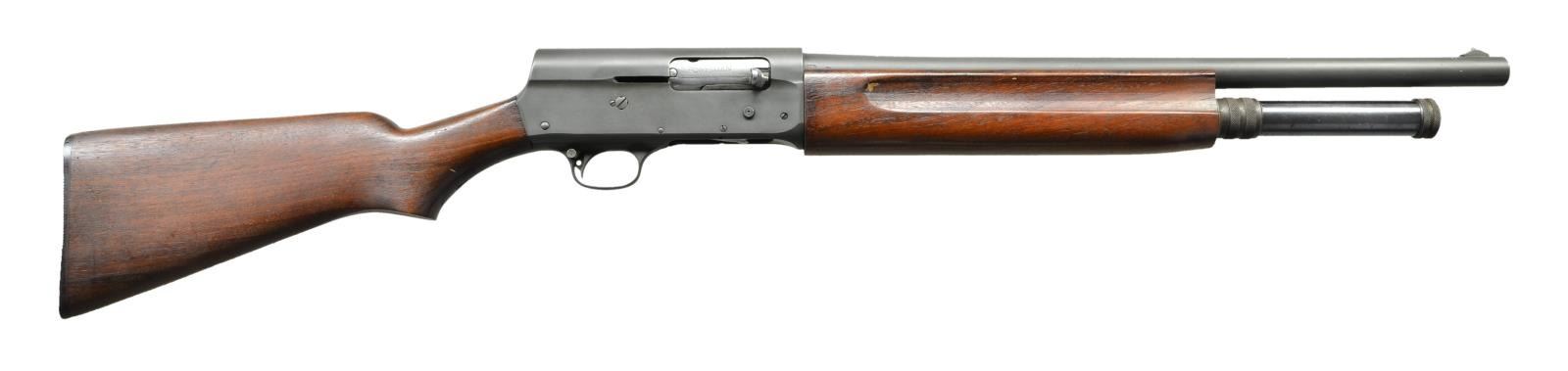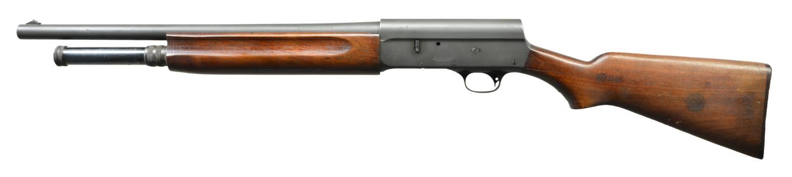SHOTGUN. Cal. 12 ga. S# 703800. Bbl. 20" plain w/ ramp mounted bead front sight & cyl. bore. No visible choke marking. Left side near breech has inspector's mark "RMN". Top of bbl. & left side of frame are marked "US" followed by flaming bomb acceptance mark. Receiver is marked "MILITARY FINISH". Breechblock is marked "THE SPORTSMAN" & is an apparent replacement. Recoil operated square stern action. Parkerized finish. Mag. tube has non standard 2 shot extension. Forearm is unusual finger groove style. Pistol grip stock has original buttplate. Left side has a crossed cannon ordnance mark followed by "FJA". Toeline of stock has open hole for sling attachment. CONDITION: 90% parkerized finish showing spots of freckling. Wood has good military finish showing marks & dents. Stock is cracked through head & wrist areas. Bore shows substantial fouling. (21-3371/DS). CURIO. $400-600.