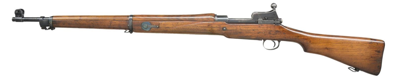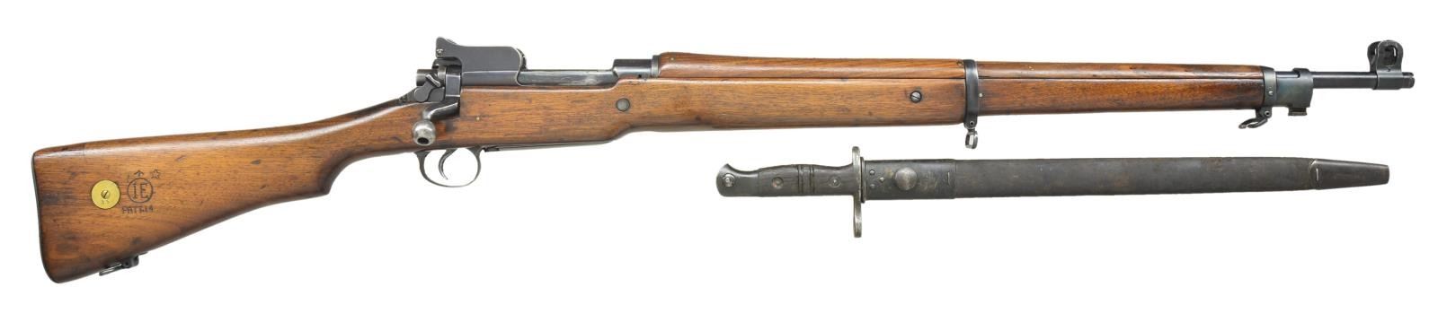 Cal. 303 British. S #706870. Bbl. 26". Bolt & rear sight are matching. Top of receiver is marked w/ a number "2", an eight pointed star, "ERA" denoting Eddystone mfg. & serial number. Left side rail is marked w/ a broad arrow & British proofs. Bolt handle, rear sight, bolt release, front band, front sight, safety, rear sling swivel & front sight are all marked w/ an "E" for Eddystone. Bottom of cocking piece is marked "W" possibly for Winchester. Ladder rear sight graduated to 1600 yards. Front & rear volley sights present. Blade front sight w/ protective ears. Bottom mounted sling swivels. Walnut stock. Right side of stock has circled Eddystone "IE" markings w/ "PATT.14", a five pointed star & a broad arrow. Brass stock disc is marked "15". UNATTACHED ACCESSORIES: Remington made P1913 bayonet & scabbard. Blade is marked w/ British proofs, 1915 date & Remington logo. Metal parts of bayonet are dulling to a gray patina w/ oxidation staining on crossguard and pommel. Grooved walnut grips have dark oil finish w/ scattered dings and handling marks. CONDITON: sanded walnut stock w/ added finish, stock has a couple armorer patch repairs, scattered dings and handling marks. Metal is turning to a dull gray patina w/ a few areas of light oxidation, scattered traces of original blue & silvering on the exposed edges. Very good bore that shows some light frosting. (22-2538/MJC). CURIO. $400-600.