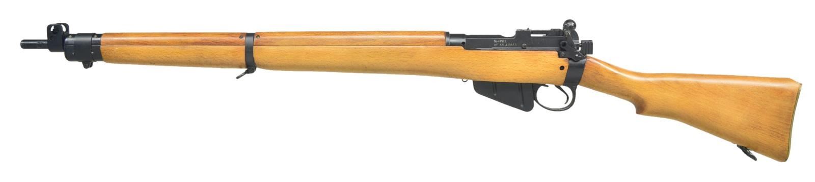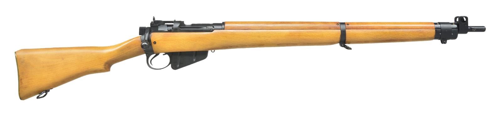 Cal. 303 Brit. S #A2853. Bbl. 25 1/2" w/ import mark. All matching numbers. Superb likely unissued example of a late No. 4 Enfield rifle. Left of receiver marked "No 4 MK2 UF55" and with S #. Ladder rear sight. Blade front sight with protectors. Provision for sling on bottom. Beech hardwood stock. MAGS: 1-10 round magazine that is matching numbered to rifle. CONDITION: beech stock shows minor handling marks & a couple dings. Metal retains 98% original Suncorite black finish. Excellent bright bore. (22-2583/MJC). CURIO. $600-800.