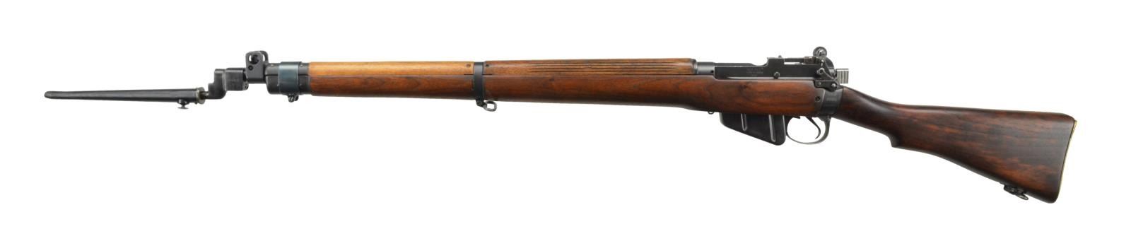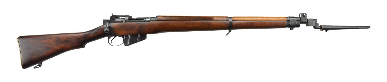303 British, S #19L8851. Left side of socket marked "N", broad arrow & Z denoting New Zealand issue. Left side of socket also has a rack number "31225". The left side of the receiver is marked "No. 4 Mk 1* LONG BRANCH 1942". Bolt matches but no visible numbers on other parts. Adjustable ladder rear sight graduated to 1300 meters. Protected blade front sight. Brass buttplate W/ trap. Hardwood stock set. UNATTACHED ACCESSORIES: spike No. 4 MK2 bayonet with scabbard. Bayonet marked with a stylized "S" denoting Savage manufacture. Rear of bayonet shows light pitting with a patch of touch-up finish on right side. CONDITION: refinished stock set shows light wear and handling marks. Metal retains 85% arsenal rework blue with some spots of touch up blue most notably on the front band. Bottom of magazine shows scattered pitting. Very good bright bore. (22-2336/MJC) CURIO $300-500