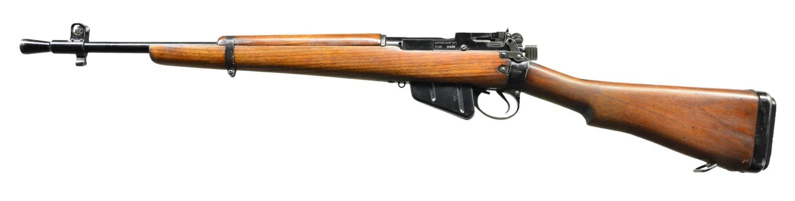 Cal. 303 British. S #N988. Bbl. 20 1/2" including flash suppressor. Bolt is matching other parts are unnumbered. Top of bbl. marked w/ British sales proofs. Top of receiver marked w/ BNP proof. Left side of socket marked w/ Broad Arrow & "ENGLAND". Left side of receiver properly marked "No5MKIROF(F)" and "5/45 S #". Correct #5 features such as lightning cuts on receiver & hollowed out bolt handle. Ladder rear sight properly graduated to 800 yds. Blade front sight w/ protective ears. Buttplate sling swivel is present but front sling swivel is not. Additional sling swivel present on underside of buttstock. Hardwood stock set. Rubber buttplate. MAGS: 1 - 10 rd. CONDITION: hardwood stock set appears lightly sanded w/ some added finish on handguard, a small chip on right side of socket, scattered handling marks & light dings. Metal retains 70% arsenal Suncorite finish w/ scratches on front band, scattered flaking & fading. Good bore w/ scattered light pitting & frosting but strong rifling. (22-3236/MJC). CURIO. $500-800.