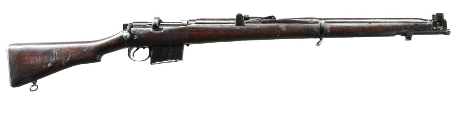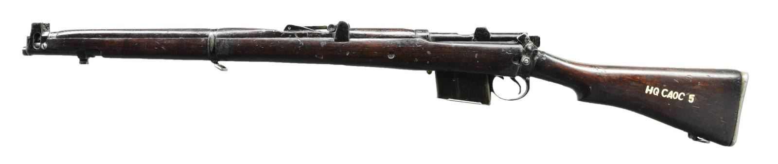 Cal. 7.62x51 NATO. S #J1307. Bbl. 25 1/2". Magazine is mismatched, other parts have matching numbers. Right side of receiver has import marking. Right side of socket marked "RIFLE 7.62MM 2A1 R.F.I. 1966". Tangent rear sight graduated to 800m. Protected blade front sight. Hardwood stock w/ Indian acceptance stamping on right side of butt and "HQ CAOC 5" in white paint on left side of butt. MAGS: 1-10 round numbered to a different rifle. CONDITION: hardwood stock shows dark oil arsenal finish w/ a couple armorer repairs at rear of handguard, a few chips, scattered dings & handling marks. Metal retains 50% arsenal black enamel finish with scattered flaking and handling marks. Cosmoline is still present inside the action &action is a bit sluggish. Very good bright bore. (22-2529/MJC). CURIO. $200-400.