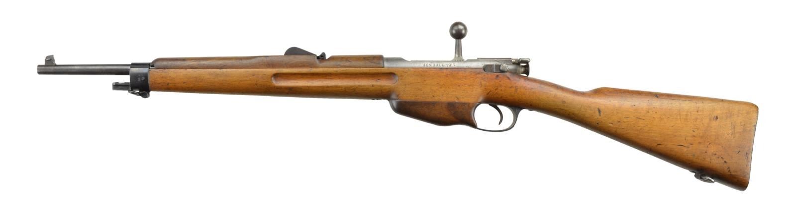 Cal. 6.5x53R Dutch. S# 7986L. Bbl. 18". Carbine appears to be a New Model No. 1. All visbile numbers are matching. Left side of receiver marked "HEMBRUG 1917". Top of receiver marked w/ a Dutch crown & serial number. Straight bolt handle. Elevator rear sight graduated to 2000m. Inverted "V" front sight. Cleaning rod not present. Bottom mounted sling swivels. Bayonet lug. Wooden magazine protector on the left side. UNATTACHED ACCESORIES: Dutch M95 carbine bayonet & scabbard. Blade marked "HEMBRUG" & crossguard marked 4391 KK. Blued parts of bayonet show edge wear, silvering & freckling. Smooth grips show some staining and dings. Leather scabbard shows scattered crazing & light flaking. Walnut stock has partially faded 1918 Hembrug cartouche. CONDITION: lightly sanded stock shows some handling marks & dings. Handguard shows a hairline crack ahead of rear sight and a small chip at left front. In-the-white receiver & bolt turning to a dull gray patina with scattered oxidation staining. Front band shows touch up blue with light freckling. Other blued parts retain 60% arsenal finish with the barrel fading to gray, silvering on the exposed edges, freckling on bottom metal and muzzle wear from bayonet use. Good bore showing minor pitting. (22-2587/MJC). CURIO. $200-400.