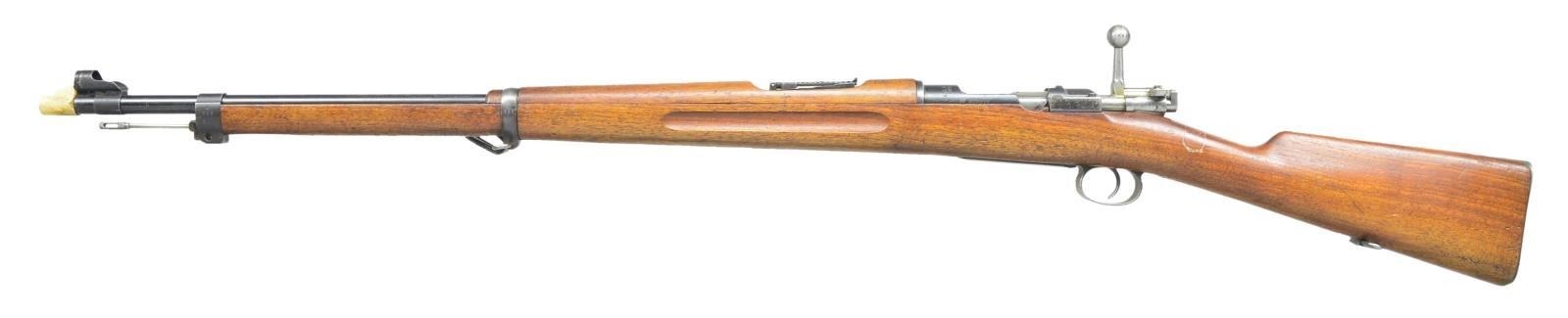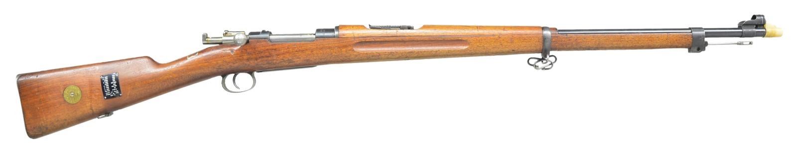 Cal. 6.5x55 Swedish. S #278898. Bbl. 29". Bolt parts, bolt release, floorplate and buttplate are matching. Other parts are mismatched. Receiver top marked w/ Swedish crown & crest & "CARL GUSTAFS STADS GEVARSFAKTORI 1911". Straight bolt handle. Cleaning rod is present. Tangent rear sight graduated to 2000m. Inverted V front sight w/ hood. Walnut stock w/ disc marked "2" for bore condition, Swedish crown acceptance on bottom of wrist and range plate. Rear sling swivel has Navy Arms tag and two other spare swivels. UNATTACHED ACCESSORIES: white plastic muzzle cover w/ Swedish style crown. CONDITION: stock has white tape outline behind upper tang, a dented area from improper rear band removal, scattered handling marks and dings. Metal retains 85% arsenal blue w/ rear sight leaf showing strong fire blue, light scratches on bbl., scattered thinning & fading. Very good bore showing some minor frosting but strong rifling. (22-2624/MJC). CURIO. $300-500.