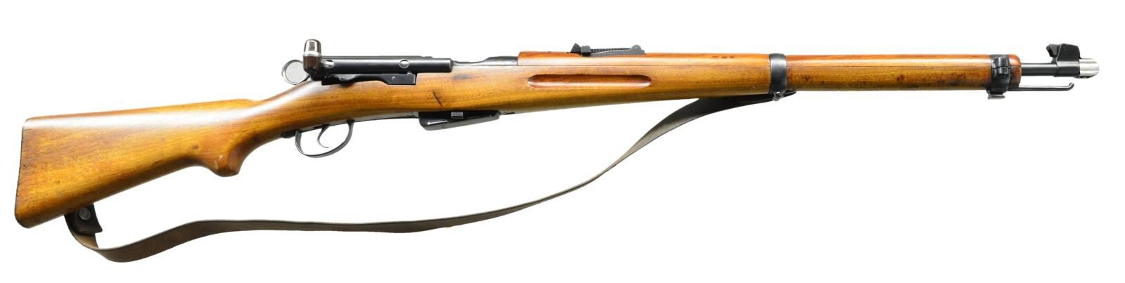 Cal. 7.5x55 Swiss. S #191541.Bbl. 23 1/3". All matching numbers with the plastic bolt knobs being unnumbered. Top of receiver marked w/ Swiss proofs. Left of receiver marked w/ S # and "P" private purchase marking. Tangent rear sight graduated to 1500m. Protected blade front sight. Stock has provision for left side sling mounting w/ original leather sling. Walnut stock w/ faint Swiss cartouche on right side. MAGS: 1-6 round mag matching numbered to carbine. UNATTACHED ACCESORIES: original muzzle cover. CONDITION: Stock set appears lightly sanded w/ a small chip behind upper tang, some dings & handling marks. Metal retains 90% arsenal reworked blue w/ some light dings in receiver area, scattered thinning & minor freckling. Excellent bright bore. (22-2460/MJC). CURIO. $200-400.