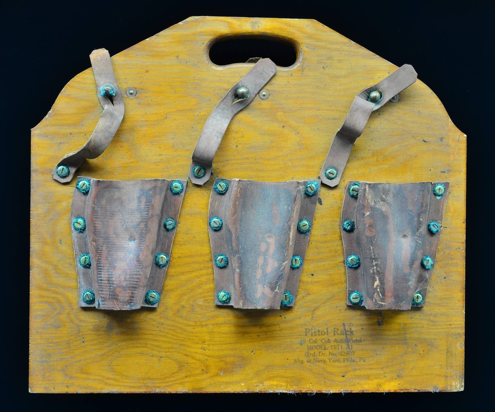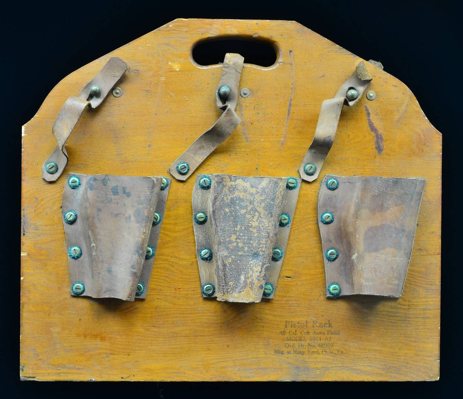 An interesting WW2 issue wood and leather rack used aboard U.S. Navy Ships to secure 6 Colt 1911A1 Automatic Pistols. Construction is wood & leather, secured w/ brass screws. Dimensions are 18" W x 15.75" H. Both sides marked; "PISTOL RACK / .45 CAL COLT AUTO PISTOL / MODEL 1911A1 / ORD. DR. NO. 42807 / MFG. AT NAVY YARD, PHILA., PA.". CONDITION: Still retains all leather holsters, straps & screws. Leather has stiffened over the years but doesn't appear cracked or damaged. Typical "greening" around brass at leather connection points. Original lettering still readable on both sides. Wood retains original finish & is structurally solid. (02-17437-6/JZ). $150-250.