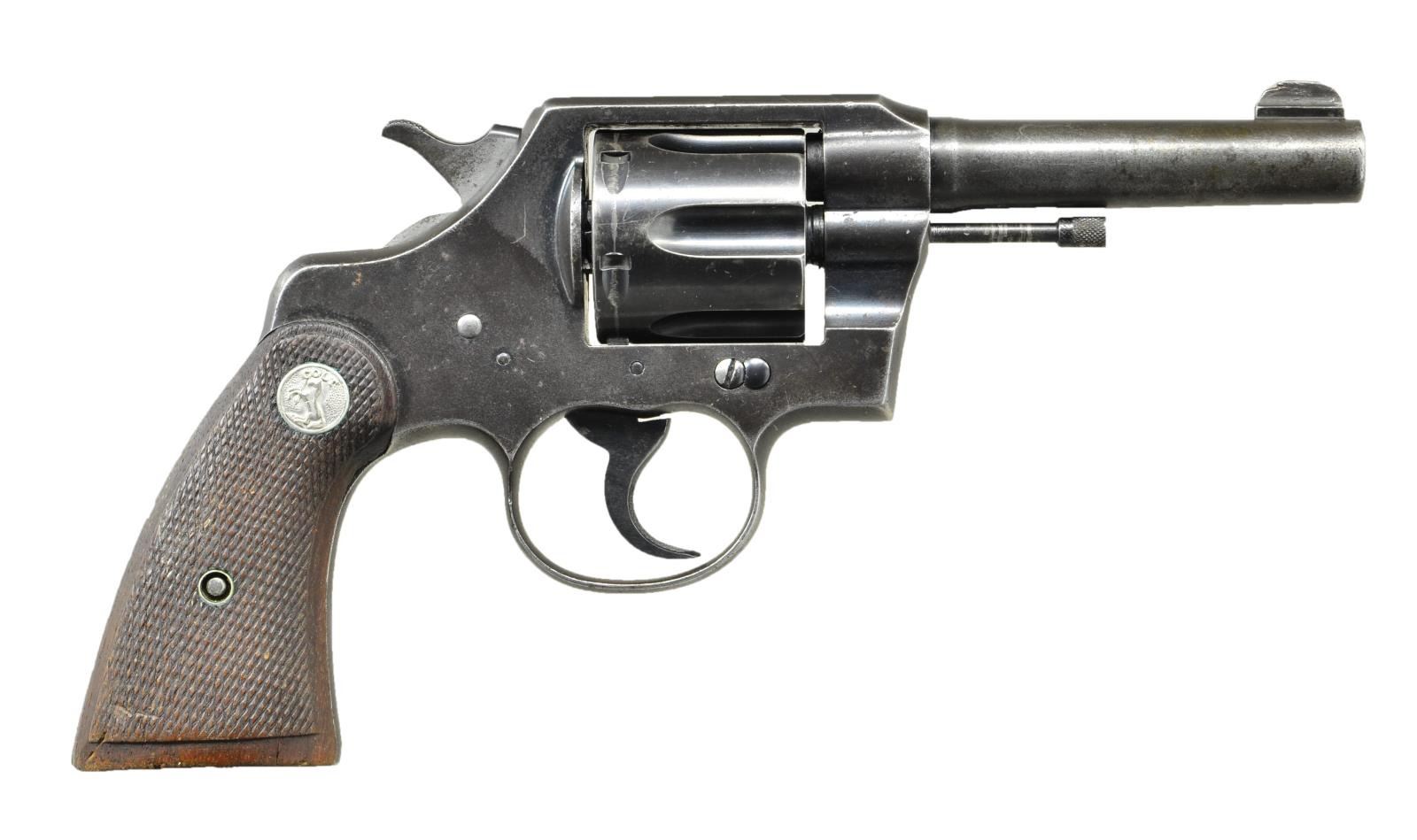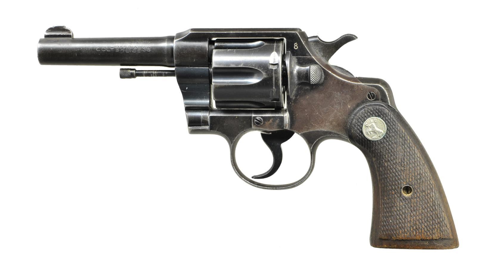 MARKED REVOLVER. Cal. 38 SPL. Ser. #721053. Bbl. 4". Frame marked at top rear on left side w/ "flaming bomb" which is enhanced in white; mfg. 1944. Sideplate has "rampant Colt". Bbl. is marked on left side "COLT" "OFFICIAL POLICE" & "PT. 38". Top of bbl. has patent markings. Fixed sights. 6 shot cyl. "SA/DA". Checkered walnut grips w/ Colt medallions. CONDITION: grips have moderate to heavy wear w/ flattened diamonds. Right grip has missing chip at front strap. Metal has traces of blue turning gray w/ moderate wear & oxidation throughout. Front sight has been slightly modified by filing. Bore is shiny w/ worn lands & areas of oxidation. (22-4275/RW) CURIO. $300-500.