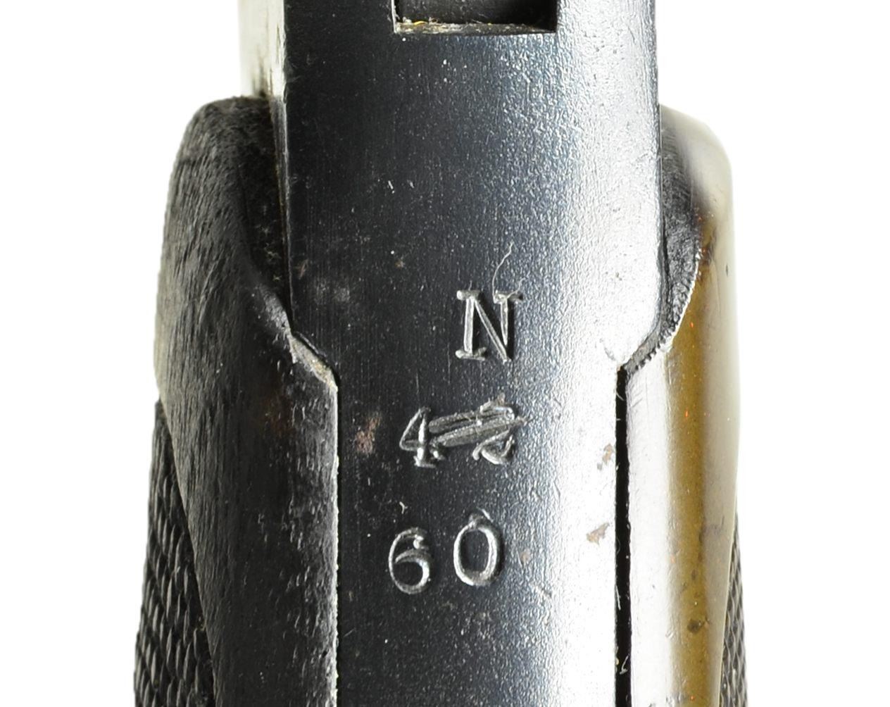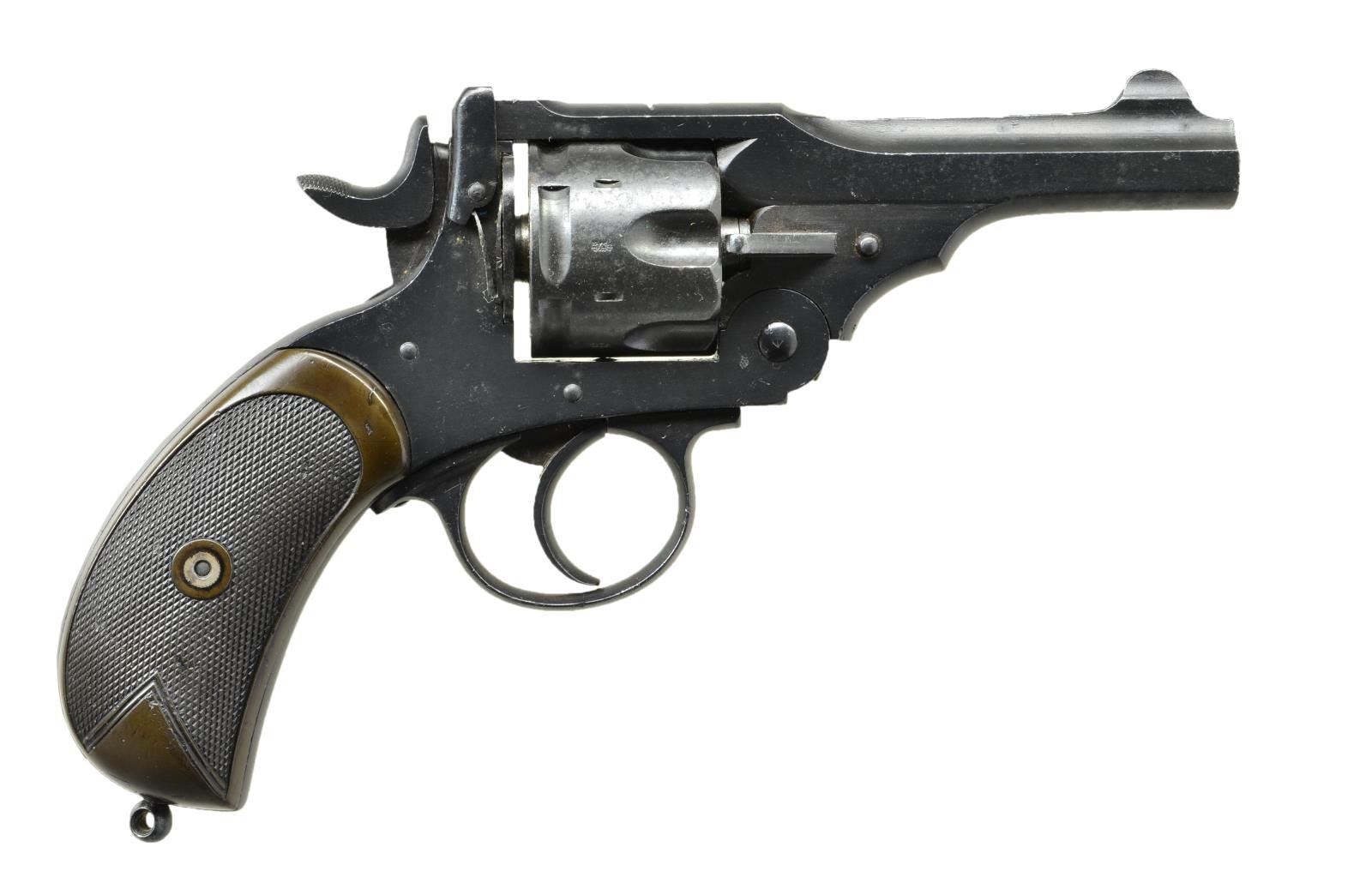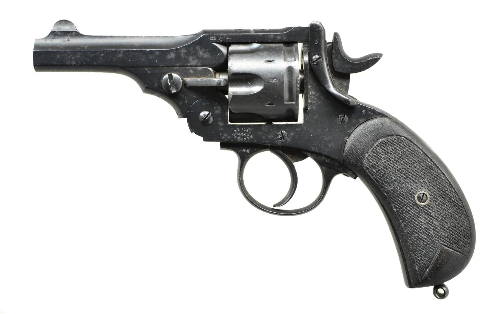 Cal. 45 Auto Rim. Ser. #57908. Numbers match on bbl. & frame. S# on cyl. is rendered obscure. Bbl. 4". Fixed sights. SA/DA. Caliber was .455 Webley MKII. Cyl. has been shortened to permit the use of 45 Auto Rim ammunition. Frame is marked on left side w/ "WEBLEY MARK II" & "PATENTS". Backstrap is marked "N/60". "43" has been lined out. This "N" marking coupled w/ lg. "broad arrow" indicates usage by the Royal Navy. Bbl. is marked on left side of top strap w/ view marks & "broad arrow". "Birds head" type grip. Grip panels are checkered walnut on left side & checkered brown plastic on right. Lanyard stud w/o ring at end of grip. CONDITION: walnut grip has extensive wear, staining & damaged diamonds. Right grip has notably better appearance w/ light wear & scattered handling marks. Metal retains 80% original blue w/ moderate wear & scattered oxidation throughout. Bore is shiny w/ notably worn lands. (22-4355/RW) CURIO. $350-550.