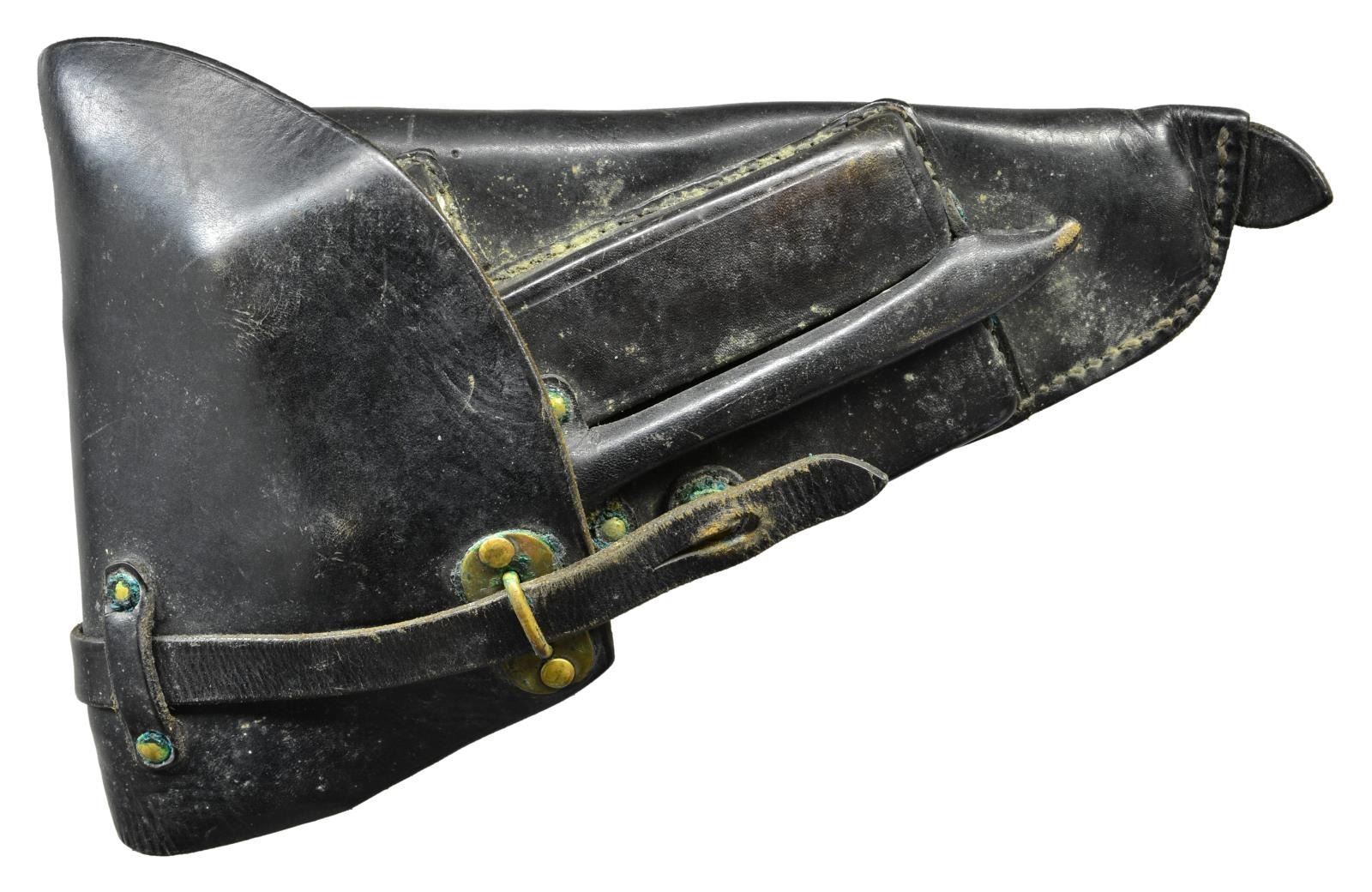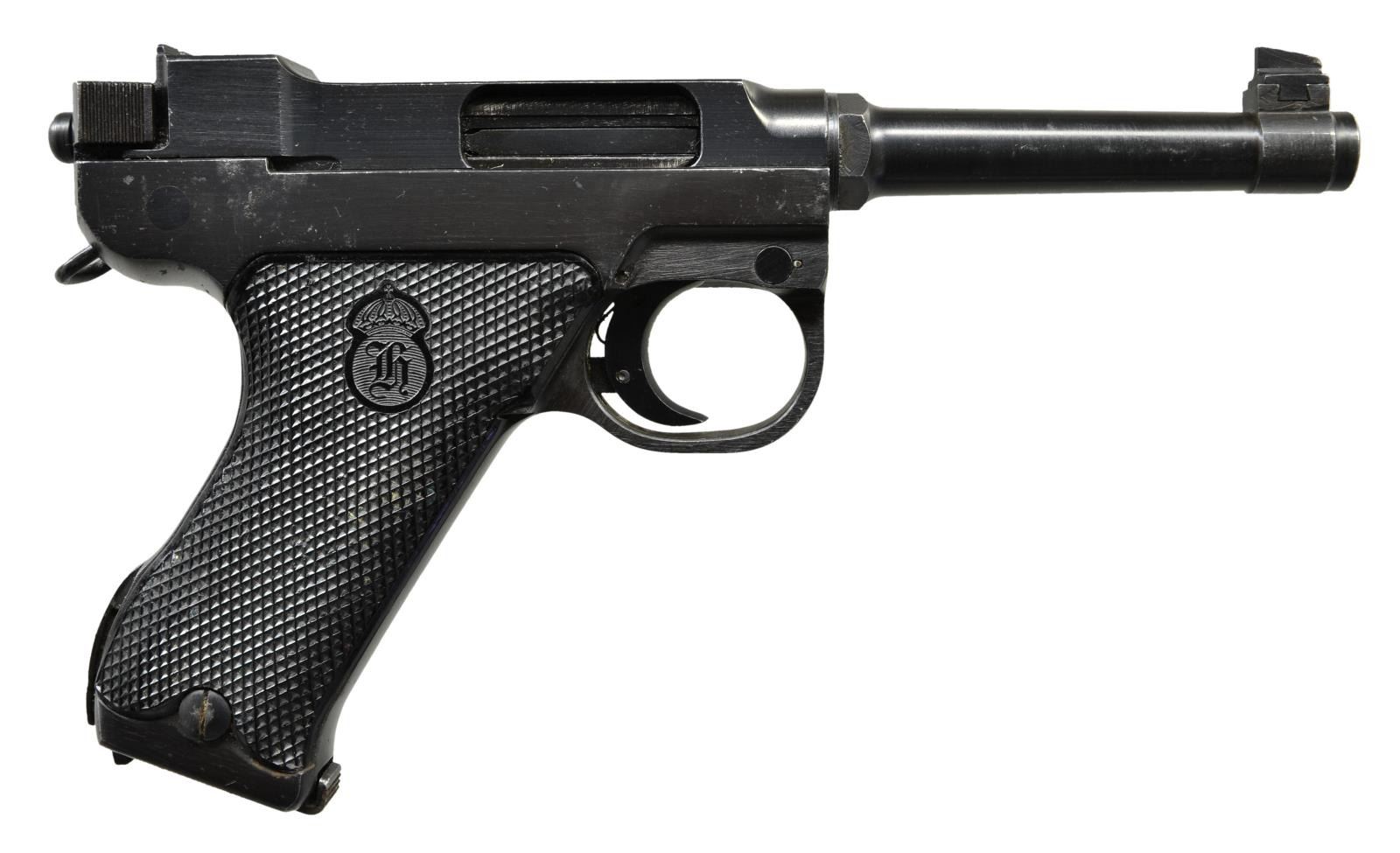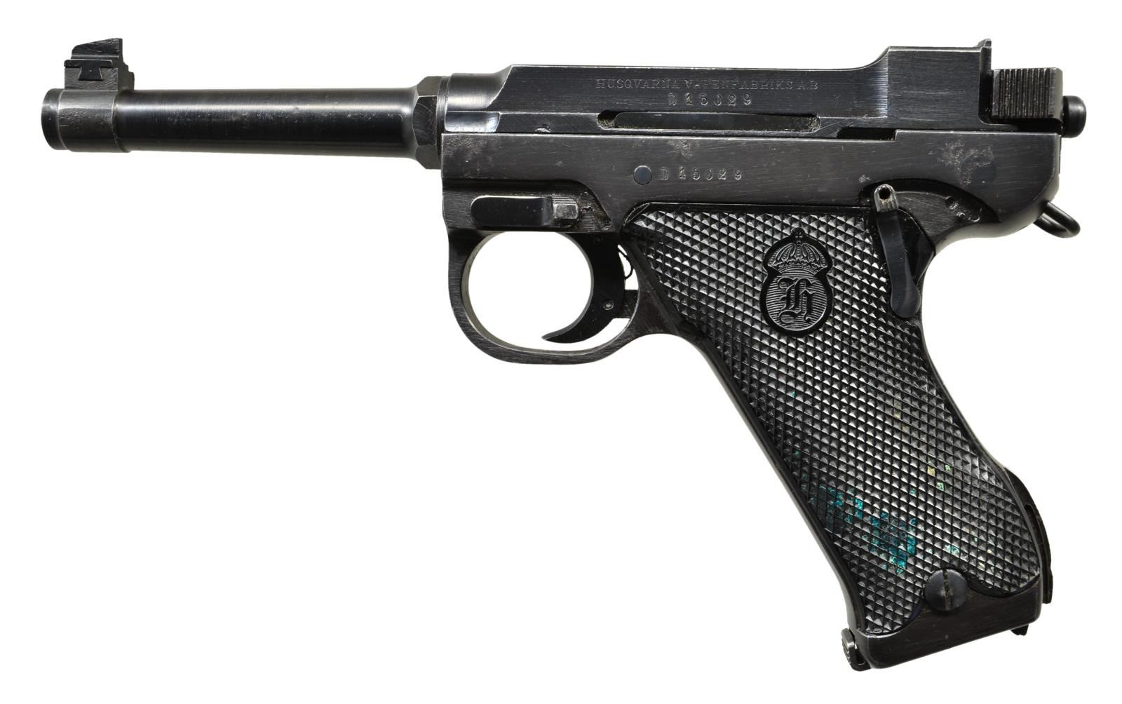 Cal. 9mm Luger. S# D15029. Bbl. 4 3/4". Blade front sight. Fixed U notch rear sight. Front of trigger guard has import marking. Black checkered grips w/ Husqvarna logo. MAGS: 2-8 rd. UNATTACHED ACCESSORIES: loading tool & cleaning rod that show scattered oxidation & black leather holster that shows scattered staining. CONDITION: grips show dirt staining & handling wear. Metal retains 85% arsenal rework blue w/ some scattered freckling, handling wear & high edge wear. Slide not cocking correctly & will require mechanical attention, unable to determine bore condition due to this issue. (22-3041/MJC). CURIO. $700-1,100.