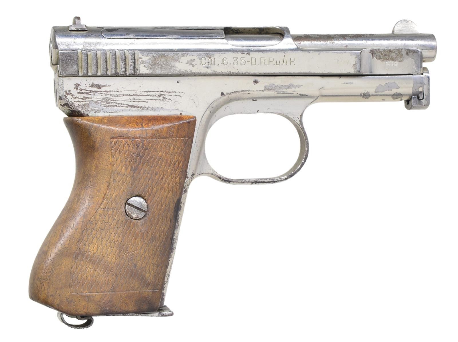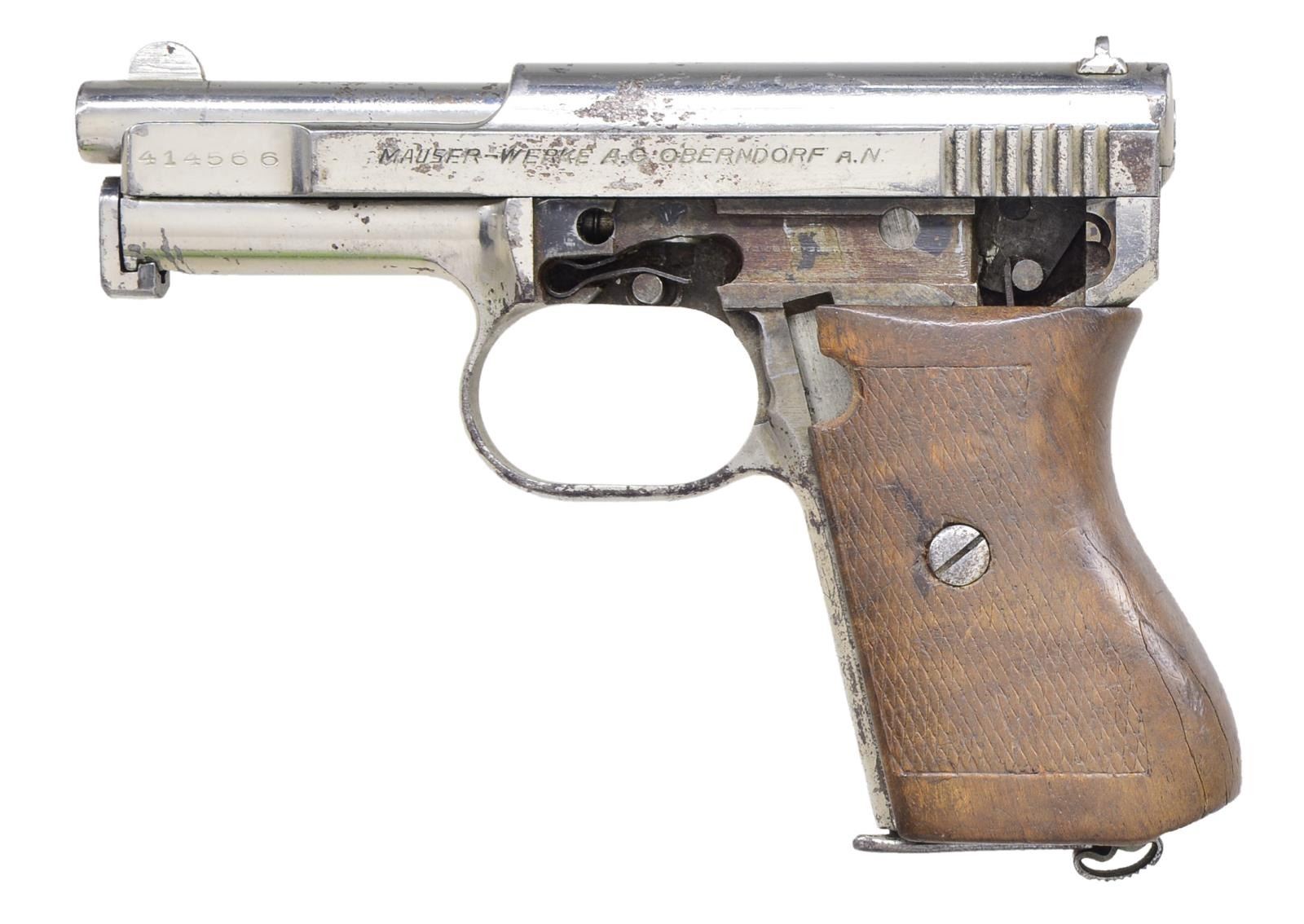 Cal. 6.35mm (25 ACP). S# 414566. Bbl. 3". Gun has crown over U proofs. Missing left sideplate, slide release & trigger assembly. Checkered walnut grips. MAGS: 1 nickel finished 9 rd. w/ bent base plate & scattered oxidation. CONDTION: left side of grip shows a couple 1 1/2" cracks, a couple chips. Grips show overall wear & handling marks. Metal retains 50% renickeled finish w/ a few spots of pitting, scattered flaking, scratches & oxidation. Fair bore w/ scattered pitting. (22-3204/MJC). CURIO. $100-200.