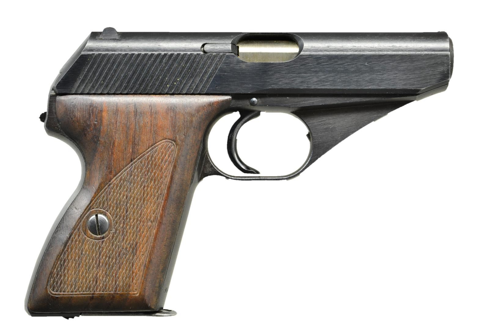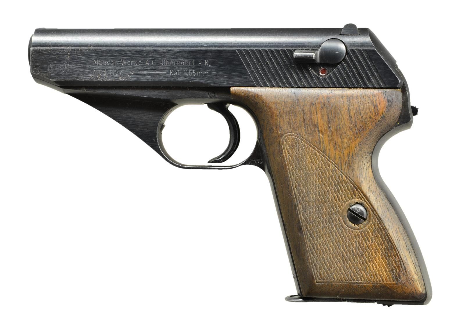 EAGLE ACCEPTANCE MARK. Cal. 7.65mm. Ser. #946408. Bbl. 3-3/8". SA/DA . Fixed sights. Pistol is marked on left side of slide w/ Mauser banner "Mauser-Werk A.G. Oberndorf a.N." "MOD. HSc" "3 lines" "Kal. 7.65mm". Marked on rear of trigger guard w/ "WaA 135". Commercial proof "Eagle N" is marked on right side at rear of trigger guard & also at right forward end of slide. Bbl. is unmarked. Checkered walnut grips. MAGS: 1 unmarked 8 rd. CONDITION: grips have light wear & scattered handling marks w/ flattening of diamonds. 90% original blue w/ light high point wear & scattered sm. spots of oxidation. Good shiny bore. (22-4320/RW) CURIO. $400-600.