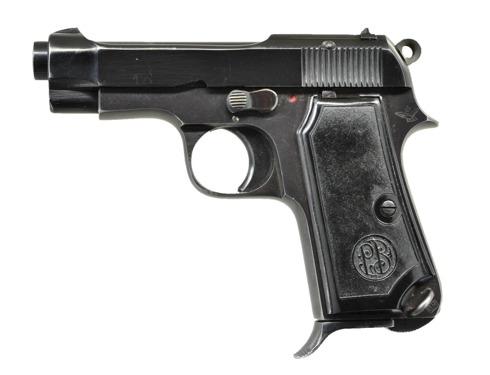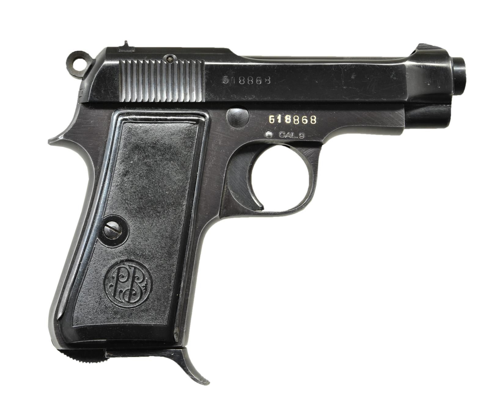 Cal. 9mm Kurz (380 ACP). S# 618868. Matching S #'s on Bbl. and slide. Bbl. 3 3/8". Blank slide variation w/ S # on right side of slide. Right side of frame marked w/ white enhanced S # and "CAL. 9". Left rear of frame marked w Italian air force eagle marking. Grips marked w/ PB logos. MAGS: 1 unmarked 7 rd. CONDITION: grips show light handling wear. Metal retains 90% original two tone blue w/ some light oxidation on top rear of slide, light high edge wear and some fading to gray on both straps. Very good bore. (22-3555/MJC). CURIO. $400-600.