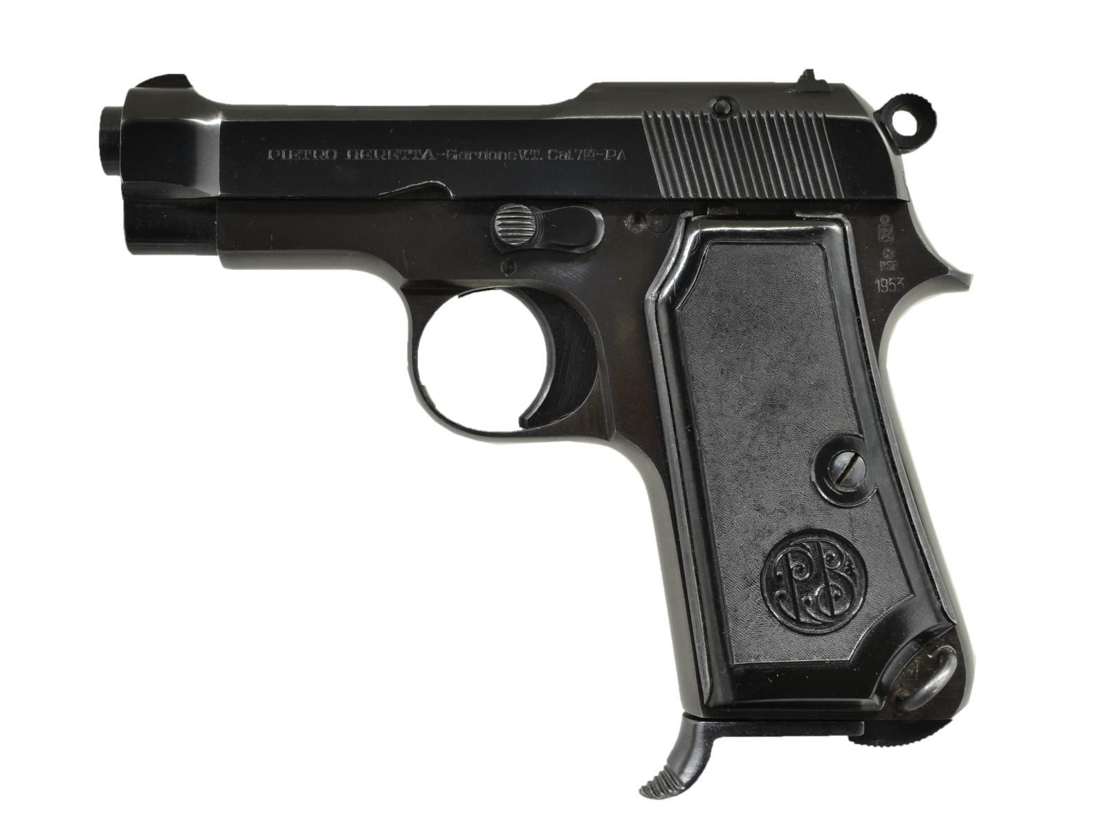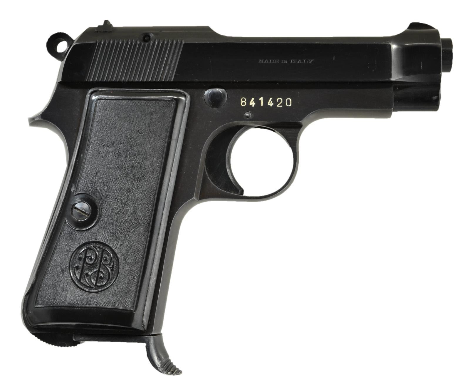 Cal. 7.65mm (32 ACP). S #841420. Matching S # on slide and bbl. Bbl. 3 3/8". Left side of slide marked w/ single line Beretta markings. Left rear of frame has Italian proofs and 1953 date. Right side of frame has S # w/ white highlight. Right side of slide is marked "MADE IN ITALY". PB marked black plastic grips. MAGS: 1-8 rd. marked "Cal. 765 BERETTA". CONDITION: grips show a few dings and some handling wear. Metal retains 95% original blue. Near excellent bore. (22-3573/MJC). CURIO. $300-500.