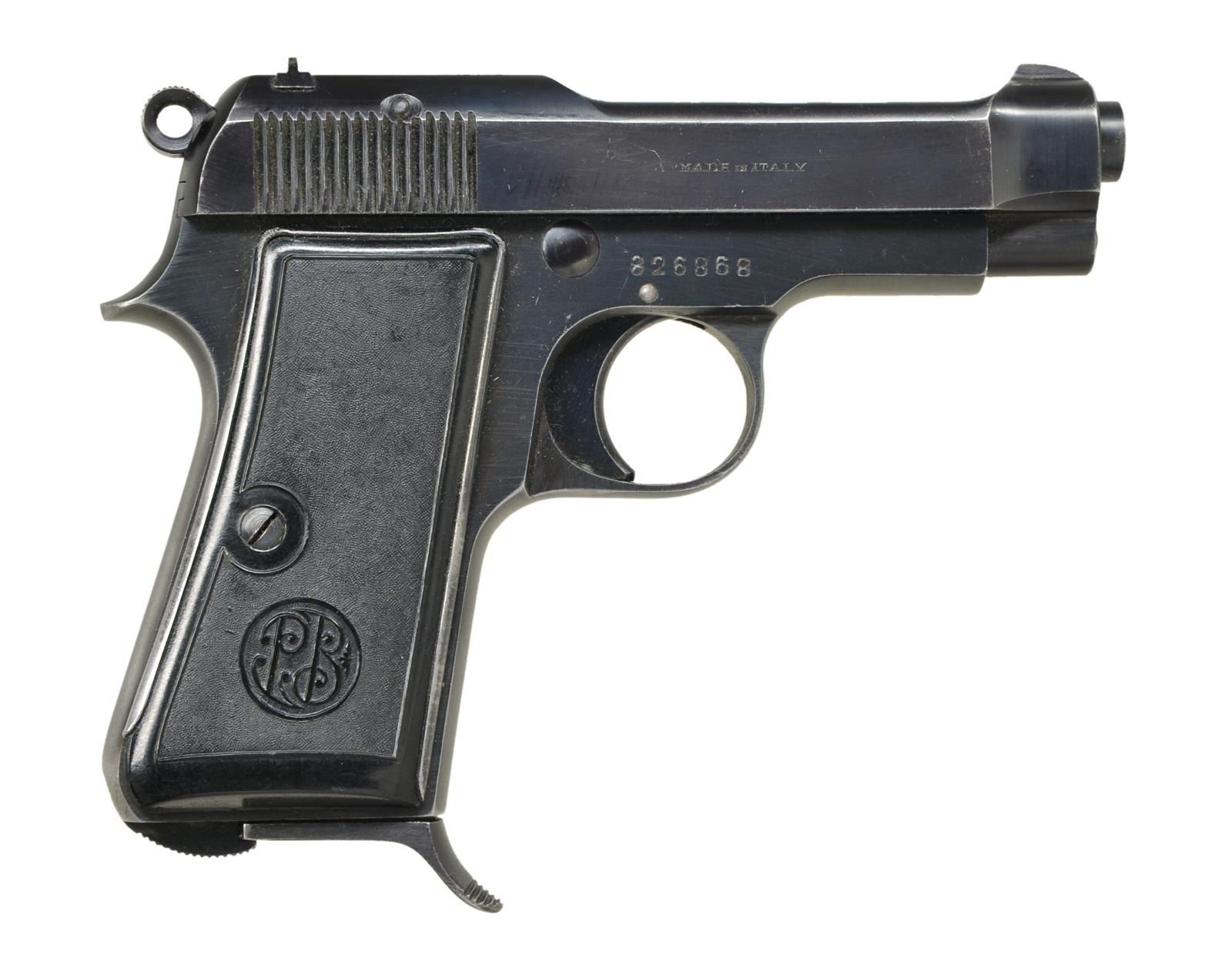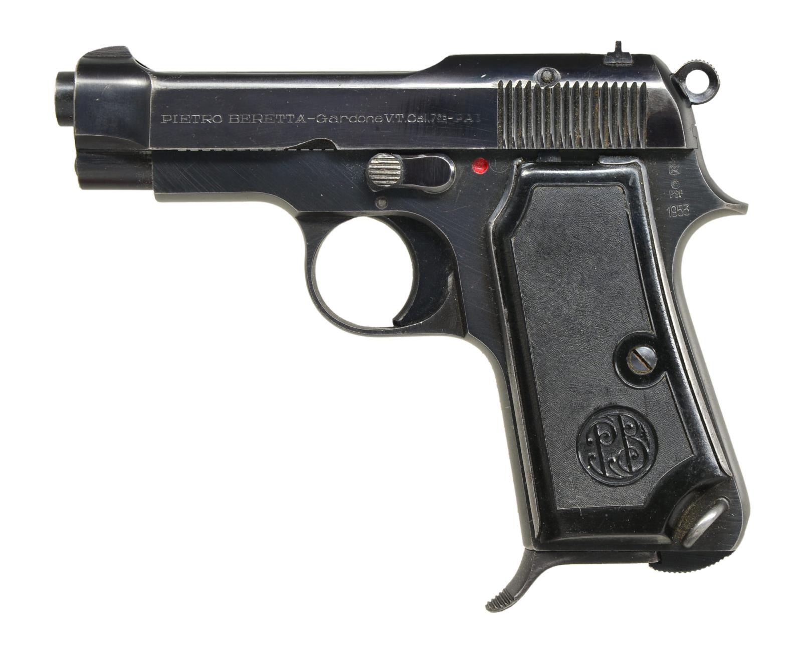 Cal. 7.65mm (32 ACP). S #826868. Bbl. 3 3/8". Right side of slide marked "MADE IN ITALY". Left rear of frame marked w/ Italian proofs & 1953 date. Left side of slide has Beretta single line marking. Hard plastic PB marked grips. MAGS: 1-8 rd. CONDITION: grips show flaking & handling wear. Metal retains 90% original blue w/ a couple small tool marks on right top of slide, some freckling on back strap, high edge wear & a few light scratches. Very good bore. (22-3189/MJC). CURIO. $300-500.