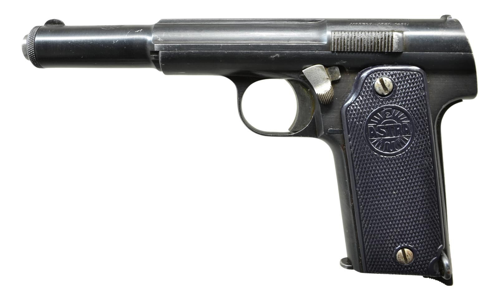 Cal 9mm Largo. S# 86843. Bbl. 6". Bbl. marked 9mm & 38. Right side of frame has import marking. Checkered black rubber grips w/ Astra logo. MAGS 1-9 rd. UNATTACHED ACCESSORIES: aftermarket cardboard box w/ handwritten end label numbered to gun, a printed out history of the Astra 400 pistol & spare unmarked grooved grips. CONDITION: Astra marked grips show scattered handling wear & a couple chipped points. Metal retains 90% arsenal rework type blue w/ a few spots of blued over pitting & some high edge wear. Fair bore w/ scattered frosting & light pitting. (22-3585/MJC). CURIO. $300-500.