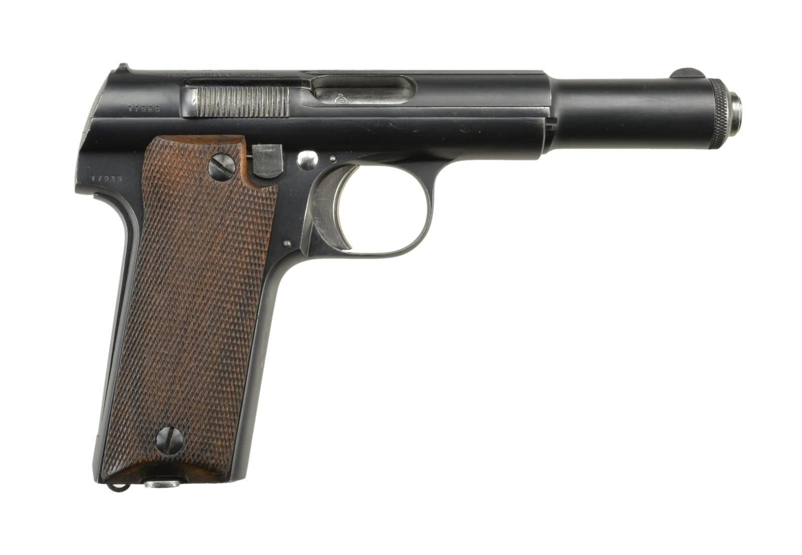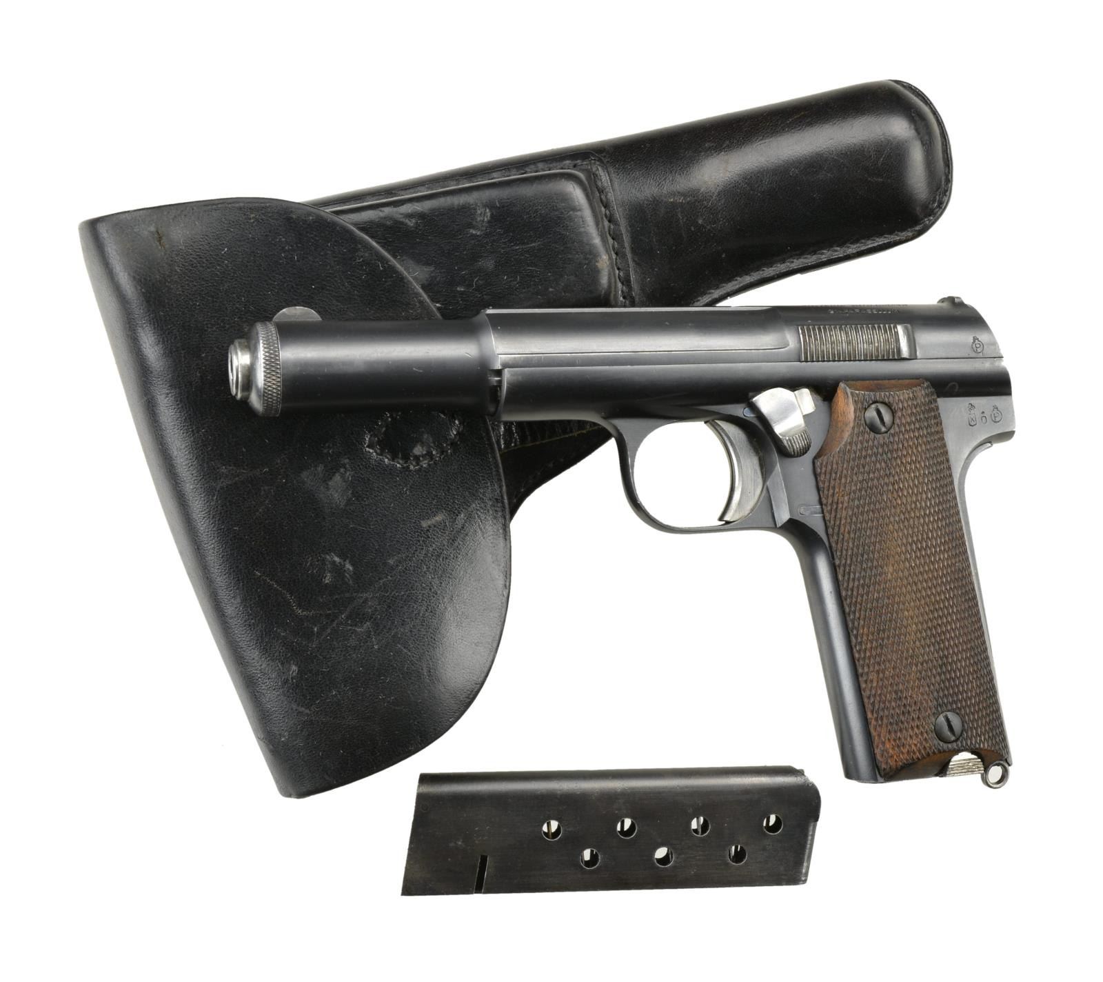 9mm Para. S #17959. Bbl 5 1/4". Matching number on slide. Spanish proofs on left rear of frame & slide. Slide marked w/ Astra markings & "MOD.600/43/9MM PARABELLUM". Left side of frame has "S" marking for safe. Checkered walnut grips. Mags 2 : factory 8 Rd. UNATTACHED ACCESORIES: LBPN German police marked holster. Back of holster is marked "LBPN/9250". Holster shows scattered light scuffing & scratches. CONDITION: grips show light handling wear. Trigger, magazine release & slide release show strong traces of straw. Balance of metal retains 95% original blue w/ operational wear, light silvering & a few minor spots of freckling. Very good bore. (22-2414/MJC). CURIO. $300-500.