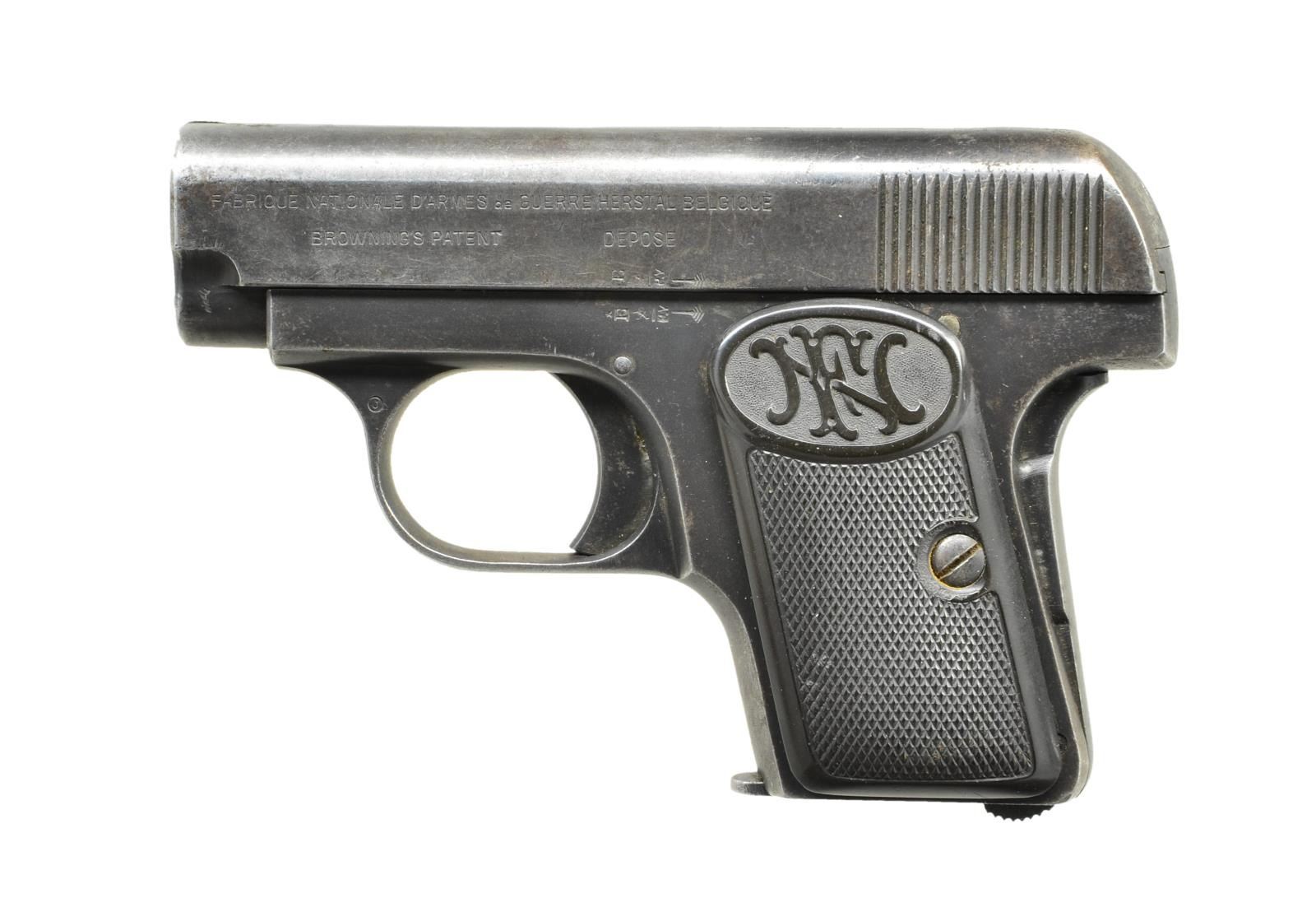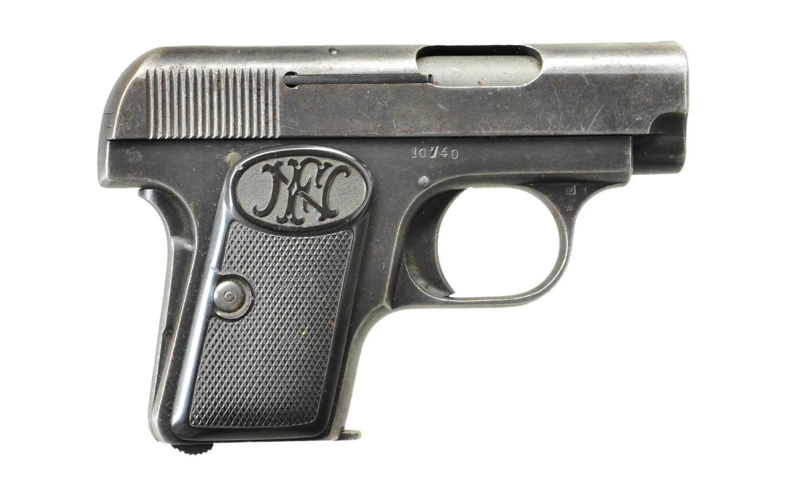Cal. 6.35mm (25 ACP). S# 10740. Bbl. 2". First variation w/out slide lock. Checkered FN logo rubber grips. MAGS: 1-6 rd. marked w/ FN logo. CONDITION: grips show moderate wear. Metal retains 40% original blue w/ scattered fading to gray, high edge wear & light oxidation. Worn bore. (22-3161/MJC). CURIO. $200-400.