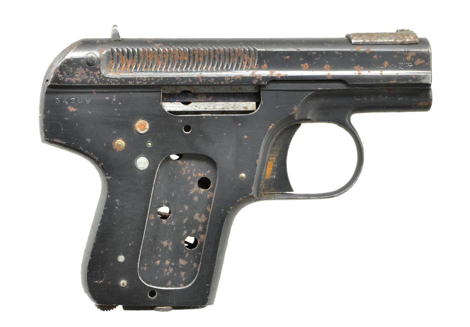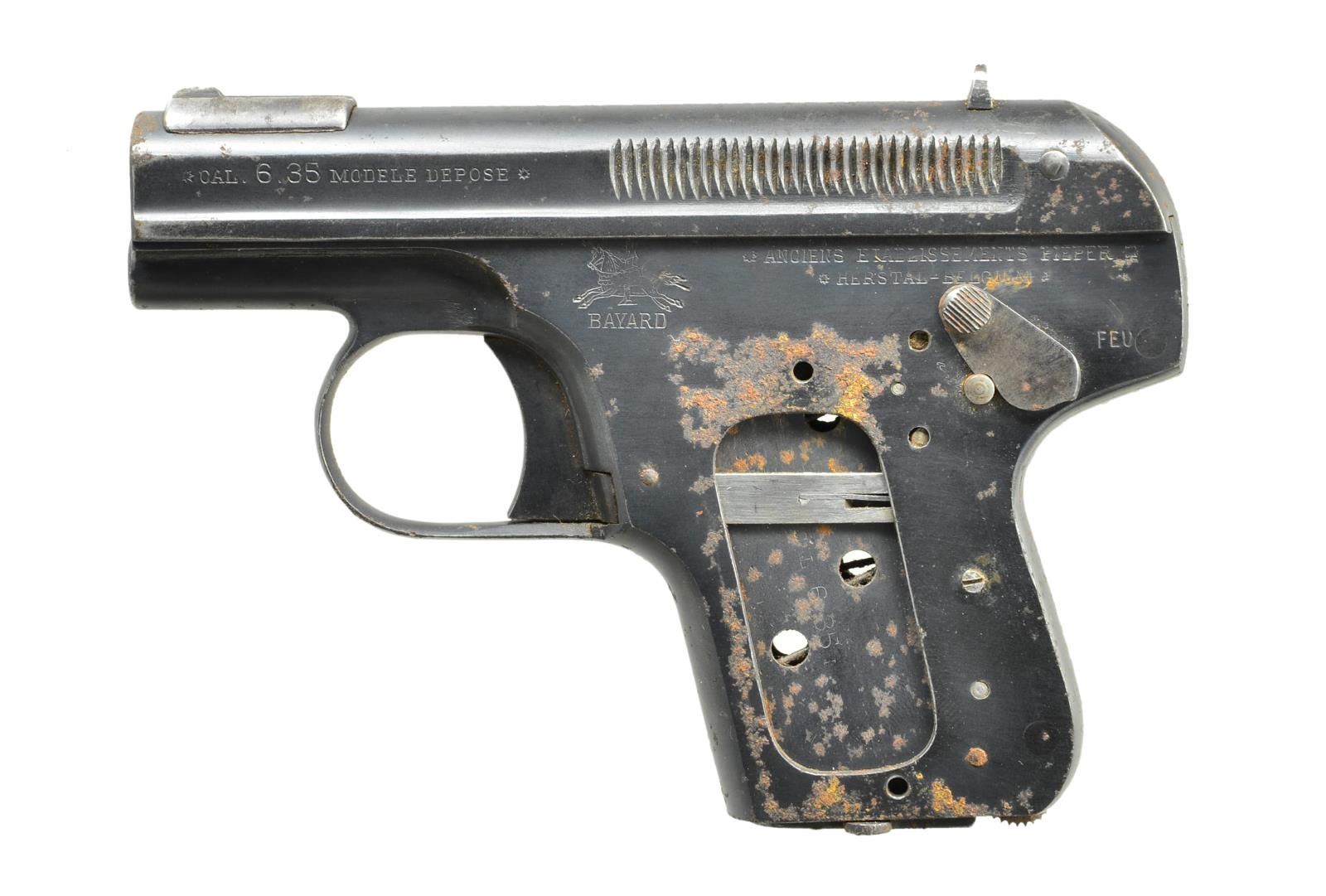 Cal. 6.35mm (25 ACP). S# 34209. Bbl. 3 3/8". Checkered rubber Bayard grips. MAGS: 1-6 rd. that shows scattered oxidation. UNATTACHED ACCESSORIES: grips that are separate from pistol. CONDITION: grips show scattered dirt staining & overall heavy wear. Metal retains 65% original blue w/ scattered oxidation. Worn bore w/ oxidation. Safety operates stiffly. (22-3199/MJC). CURIO. $100-200.