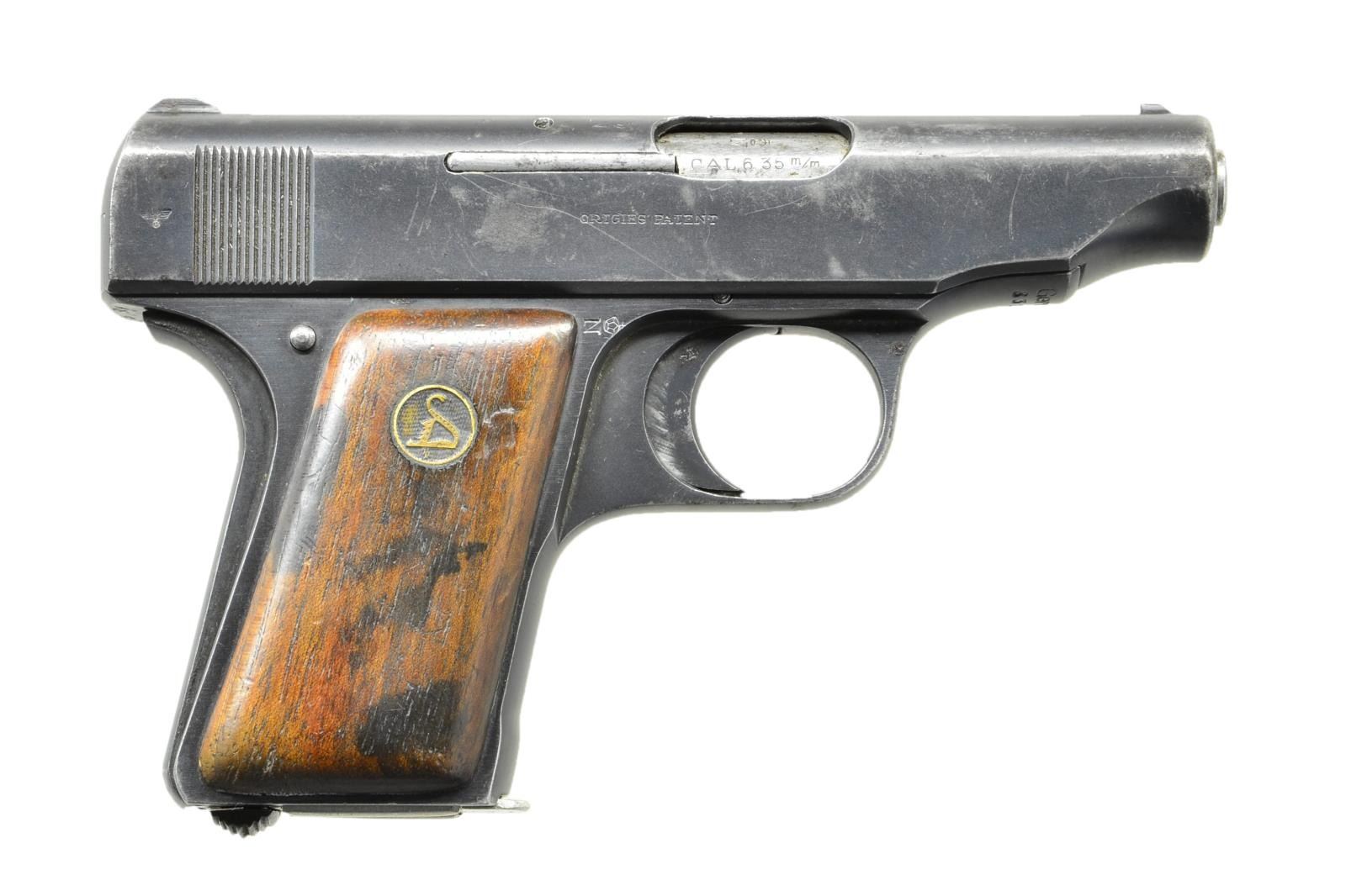 Cal. 6.35mm (25 ACP). S # 83279. Bbl. 2 3/4". Frame marked "GERMANY" below S #. Left side of frame marked "DEUTSCHE WERKE WERKE ERFURT". Right rear of slide and left front of triggerguard both marked w/ a WW2 German eagle. These markings are likely spurious. Right side of slide marked "ORTGIES PATENT". Right side of frame marked w/ crown over N proof. Smooth walnut grips w/ Deutsche Werke logo. MAGS: 1-6 rd marked w/ Deutsche Werke logo and "Cal. 6.35". CONDITION: grips show some staining, dings and scratches. Metal retains 50% original blue w/ scattered oxidation, thinning and scratches. Very good bore. (22-3162/MJC). CURIO. $200-300.