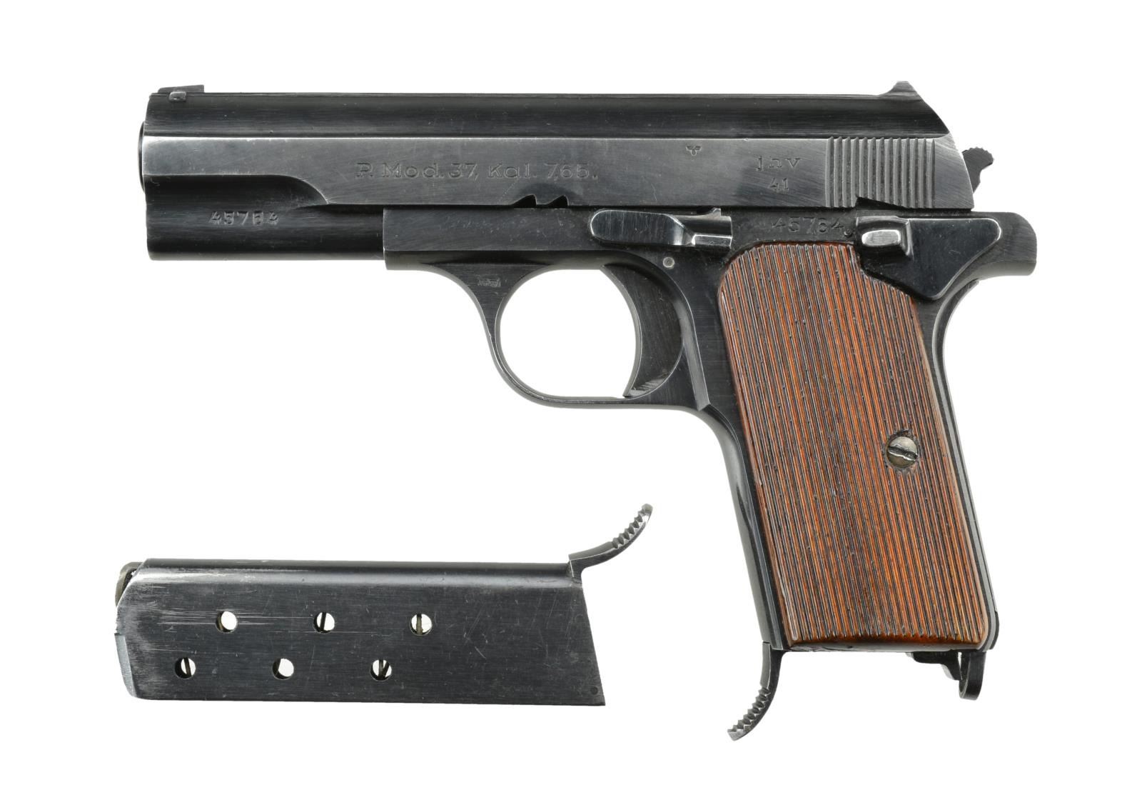 Cal. 7.65mm (32 ACP). S# 45764. Bbl 4". Matching numbers on slide & bbl. Left side of slide marked w/ "P. Mod. 37, Kal 7,65.", a German eagle & "jhv/41". Left front of trigger guard marked w/ eagle WaA58. Grooved bakelite grips. MAGS: 2-8 Rd. marked "P.Mod 37" & both have mismatched numbers. CONDITION: grips show some scattered light dings & flaking finish on bottom. Metal retains 90% original blue w/ some high wear & light freckling on both straps. Very good bore. (22-2428/MJC). CURIO. $500-800.