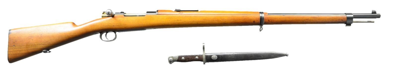 Cal. 7mm Mauser. S# M1841. Bolt is mismatched, all other S #'s matching. Top of receiver marked w/ Chilean crest. Left side rifle marked w/ "MAUSER CHILEANO MODEOLO 1895" and DWM marking. Early rear sight w/ single slider and graduated to 2000 meters. Inverted V-rear sight. Matching numbered cleaning rod present. Walnut stock w/ 1902 dated cartouche on left side of butt. UNATTACHED ACCESSORIES: Chilean 1895 bayonet & scabbard. Bayonet is numbered "A1830" and maker marked by Weyersberg Kirschbaum. Bayonet also has Chilean crest. Metal parts of bayonet dulling to gray patina with scattered oxidation and dried grease. Grip panels show scattered handling wear, dings and light chips. Scabbard is numbered "B2864" and shows scattered silvering, wear and light oxidation. CONDITION: walnut stock shows minor dings and handling marks. Metal retains 90% original blue w/ some wear on buttplate, front band keeper and handling marks. Bolt release, follower and rear band keeper show strong amounts of fire blue. Very good bore w/ dried cosmoline. (22-2507/MJC). CURIO. $300-500.