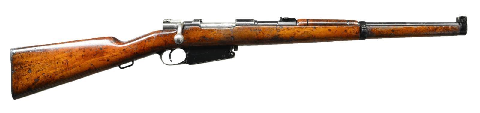 Cal. 7.65.x53 Argentine. S #C1590. Bbl. 17 3/4". Stock & rear sight mismatched but other visible numbers are matching Left side rail marked "MAUSER MODELO ARGENTINO 1891" and with DWM address. Receiver ring marked w/ faint Argentine crest. Bent bolt handle. Rear sight graduated to 1400m. Inverted V-front sight w/ protectors. Saddle bar on bottom of wrist. Mag. has retaining screw. Walnut stock w/ Argentine cartouche on right side of butt. CONDITION: refinished walnut stock set has added varnish, repaired crack on handguard, 1" crack behind upper tang, scattered flaking, dings & handling marks. Metal retains 70% of a black paint finish w/ scattered flaking & oxidation on buttplate. Fair bore showing some frosting & light pitting. (22-2462/MJC). CURIO. $400-600.