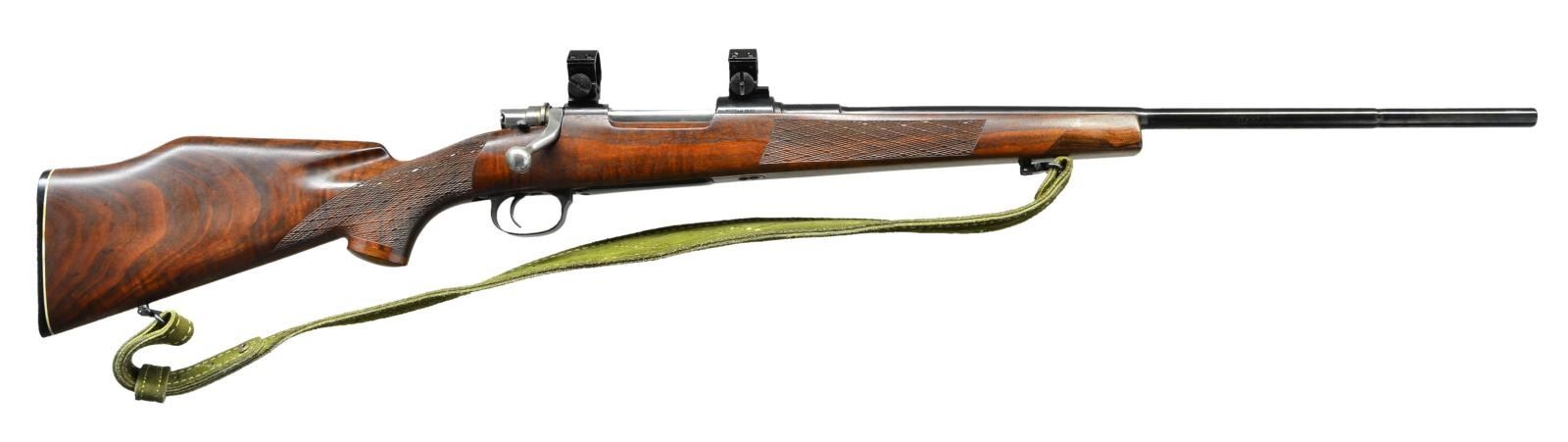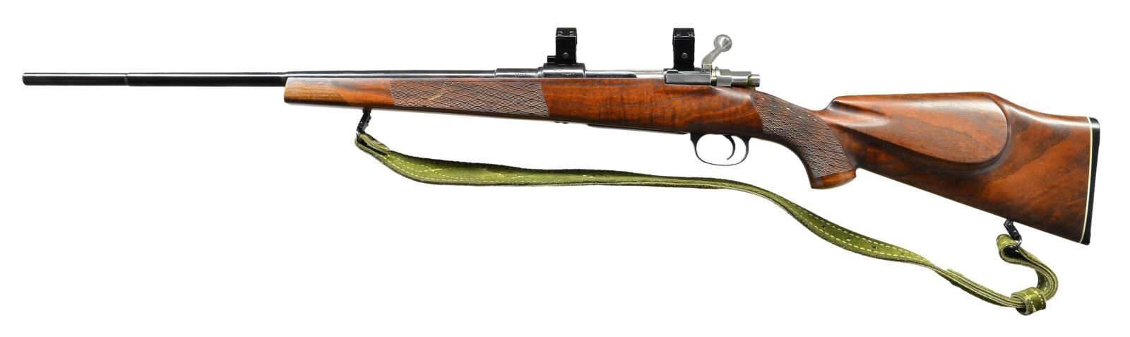 Cal. 30-06. S #11441. Bbl 22 1/2". No sights are present. Rifle has receiver mounted scope bases w/ split rings. Altered turned down bolt handle. Modified safety mounted to right of upper tang. Bottom mounted sling provisions w/ aftermarket sling. Monte Carlo walnut stock. Fajen marked grooved buttplate. CONDITION: stock set shows some light handling wear. Metal retains 95% reblue finish w/ an area of blued over light pitting on right side of Bbl. Good bore w/ some light pitting & frosting. (22-2501/MJC). MODERN. $100-200.