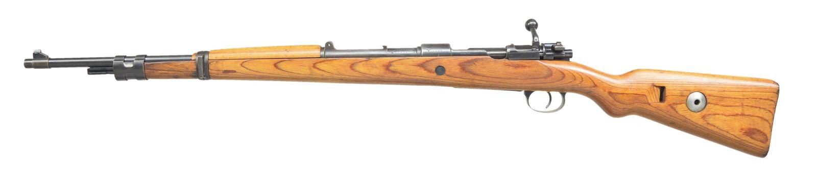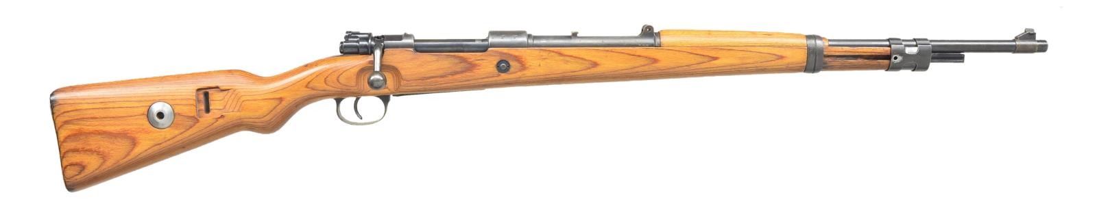 Cal. 8mm Mauser. S #1837i. Bbl, receiver, bolt parts, bolt release, triggerguard, floorplate, front sight and action screws have matching #s, other parts mismatched or unnumbered. Top of receiver marked "243" and 1939. Right side of receiver marked with 3 eagle "26" proofs. Left side of receiver marked with S # and Nazi eagle proof. No rear sight assembly, band keeper, rear locking screw, cleaning rod or follower assembly present. Front band appears to be from another model 98 Mauser. Blade front sight. Reproduction laminated stock set w/ flat buttplate & steel takedown disc. Handguard loose due to lack of band keeper. CONDITION: stock set has some sanding marks near buttplate, a small spot of filler at toe and some light handling marks. Barreled action shows a fading original blue finish with some silvering and spots of light oxidation. Bottom metal shows a reblue finish with dings beneath the blue and fading. Rear band shows scattered light pitting. Front band shows some damage from improper removal. Buttplate is a gray patina with scattered pitting. Good bore showing light frosting. (22-2346/MJC). CURIO. $400-600.