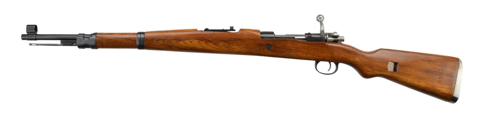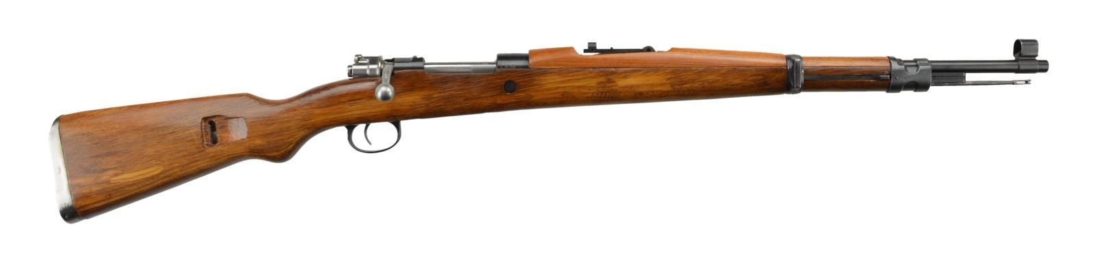Cal. 8mm. S #B4507 .Bbl. 23 1/2" w/ import marking. All matching numbers. Top of receiver marked w/ Yugo crest. Left side of receiver marked with Yugo characters. Left side rail marked w/ "PREDUZECE 44". Rear sight is aftermarket peep mounted on rear sight base. Front sight is inverted blade w/ hood. Turned down bolt handle. Cleaning rod is present. Stamped floorplate & milled bands. Rear band is on backwards. Elm stock set w/ added 1" cut ahead of rear sight. Provision for left side mounted sling. CONDITION: elm stock shows added finish w/ some handling marks. Metal retains 95% arsenal reworked blue with some light silvering & handling marks. Very good bright bore. (22-2388/MJC). CURIO. $200-400.